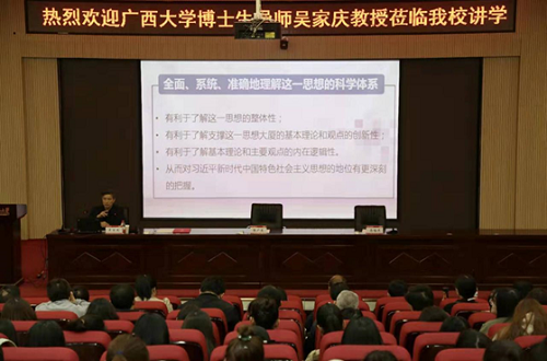 11月14日上午,广西大学博士生导师吴家庆教授应邀莅临我校讲学。讲座在东校区思想政治课实践教学平台举行。马克思主义学院教师、博士生、硕士生和本科生200余人参会。