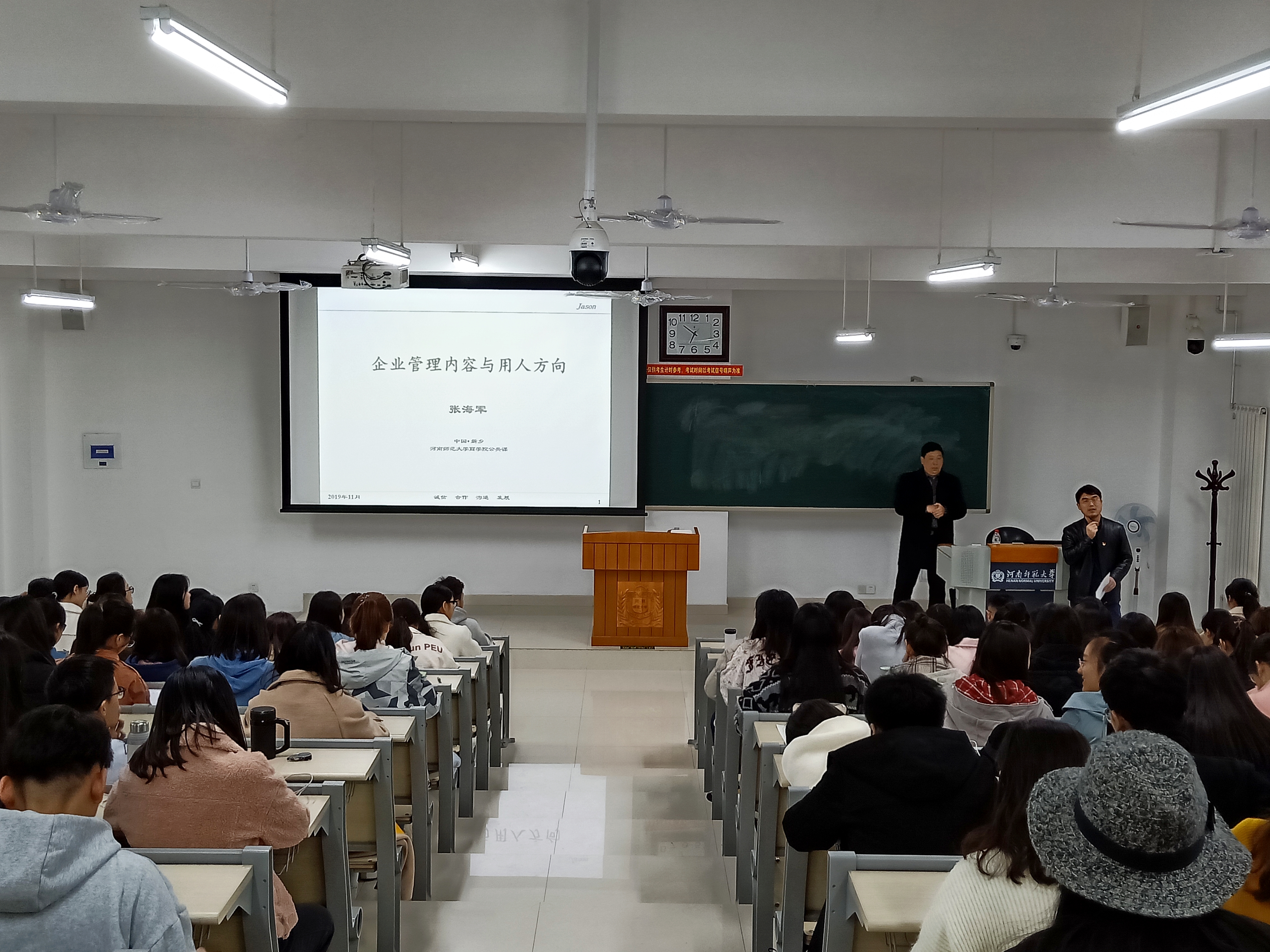 张海军的讲座主要围绕“企业管理的内容、企业用人方向、个人就业方向和个人职业规划”四个方面展开阐述。他结合多家企业的翔实数据,详细介绍了企业的管理架构、岗位设置与工作职责、任职资格与能力要求,从而为学生直观地呈现在校期间应该掌握哪些专业知识、应该培养哪些能力素质。最后,张海军结合自己的招聘经历和管理实践,为在场学生提出了学习、实习和就业的宝贵建议。