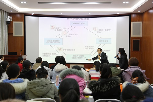 讲座中,黑田研二围绕“日本社会保障制度和医疗保险制度”,从“日本人口高龄化的现状”“社会保障制度的形成演变”“医疗保险制度的主要内容”“医疗提供体制的重组”“日本长期护理保险制度及地域综合养老服务体系的实践现状”等五个方面展开讲解。针对日本人口老龄化现状,他结合具体数据深入分析世界的人口老龄化趋势,提出人口老龄化和少子化是大势所趋,进而深入剖析了日本老龄化的特点、现状、未来发展趋势及应对措施。谈及日本医疗保险制度,黑田研二以时间为轴,结合图表分析了自二战以来日本医疗保障制度的发展变化,着重讲解了日本高龄者医疗保险制度的发展沿革。在谈到长期护理保险制度时,他从日本老人医院制度和老人福利制度的问题入手,以京都社区融入型服务实践为例,详细讲解介护保险制度的主要内容及变化,并提出理想化社区的构建蓝图。黑田研二强调,中国和日本有着相似的文化传统,面临共同的发展难题,应相互借鉴,共谋发展。