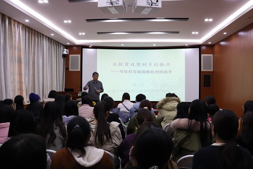 12月5日,应社会事业学院邀请,云南大学民族学与社会学学院教授钱宁在崇智楼503室作了题为“从扶贫攻坚到乡村振兴——对农村发展战略转型的思考”的学术讲座。学院教师代表、相关专业学生60余人共同参加此次讲座。讲座由学院教授王君健主持。