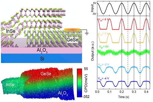 由于二维材料具有独特物理性质,通过能带设计可以获得各种新型器件。本文设计了一种接近裂隙型(Near-broken)能带排列类型的异质结,结合二维材料非常容易实现栅极静电掺杂的优势,构筑了新型可编程单边整流器。通过栅极电压调控,可以实现器件电流在复合机制和隧穿机制之间转换,以实现输出信号方向和幅度的调节。本文采用基于GeSe和InSe范德华异质结证实了可逆的正向到反向整流性能,模拟了交直流转换的效果。此项研究成果将为未来换流电路的简化提供一条可能的途径,在新型二维半导体器件领域具有潜在的应用价值。