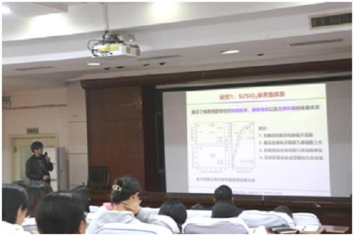 刘岳阳以“半导体器件可靠性量子模拟”为题,介绍了本研究的研究背景、所构建的研究框架以及解决的问题。他简述了量子模拟的研究背景,即半导体器件的可靠性问题和解决可靠性问题面临的挑战。刘岳阳为学生展示研究框架的建立过程,即在无定形结构建构、电子结构精确计算、电子转移理论基础上建立电子俘获理论模拟框架。他向学生介绍利用理论框架进行的一系列研究,包括Si/SiO2单层面体系,Si/SiO2/HfO2双层面体系等。
