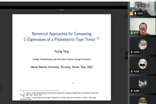 应数学与信息科学学院邀请,广西大学博士生导师杨宇宁教授于5月9日下午在腾讯会议平台上作了题为《Numerical Approaches for Computing C-Eigenvalues of a Piezoelectric-Type Tensor》的专题学术讲座。学院相关研究方向的青年教师和研究生共计60余人参加此次会议。