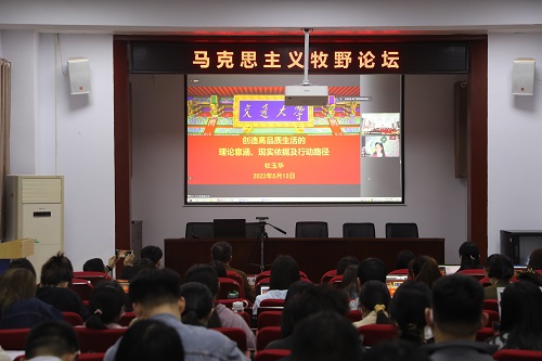 5月13日晚,国务院学位委员会学科评议组成员、中央马克思主义理论研究和建设工程专家、上海交通大学杜玉华教授应邀为马克思主义学院师生作“创造高品质生活的理论意涵、现实依据及行动路径”的学术报告,报告采取线上线下相结合的方式进行,主会场设在平原楼108会议室。学院相关负责人、学院教师代表和全体研究生、本科生参加了此次报告会。此次报告也是我校马克思主义牧野论坛第61场报告。