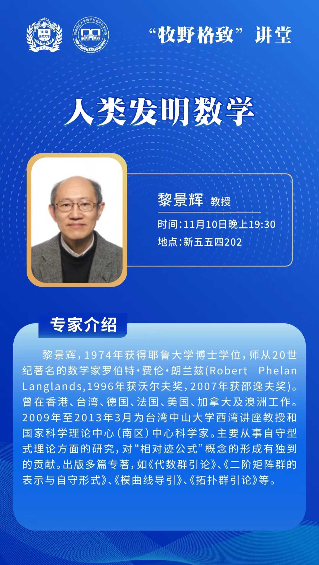 黎景辉教授将应邀做客百年校庆之“牧野格致”讲堂