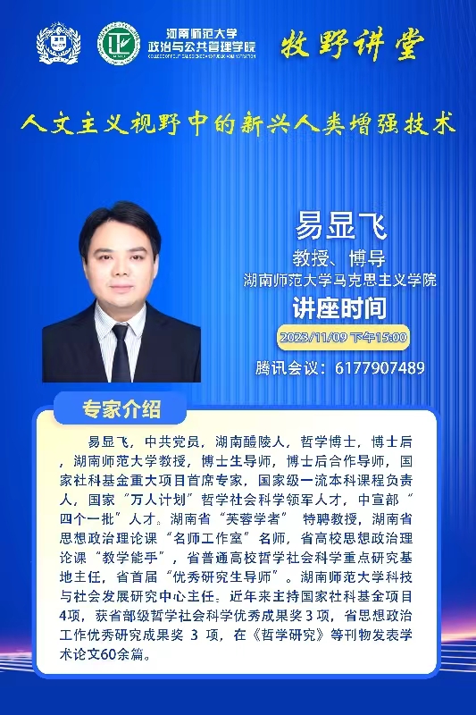 湖南师范大学易显飞教授将应邀做客百年校庆之牧野讲堂