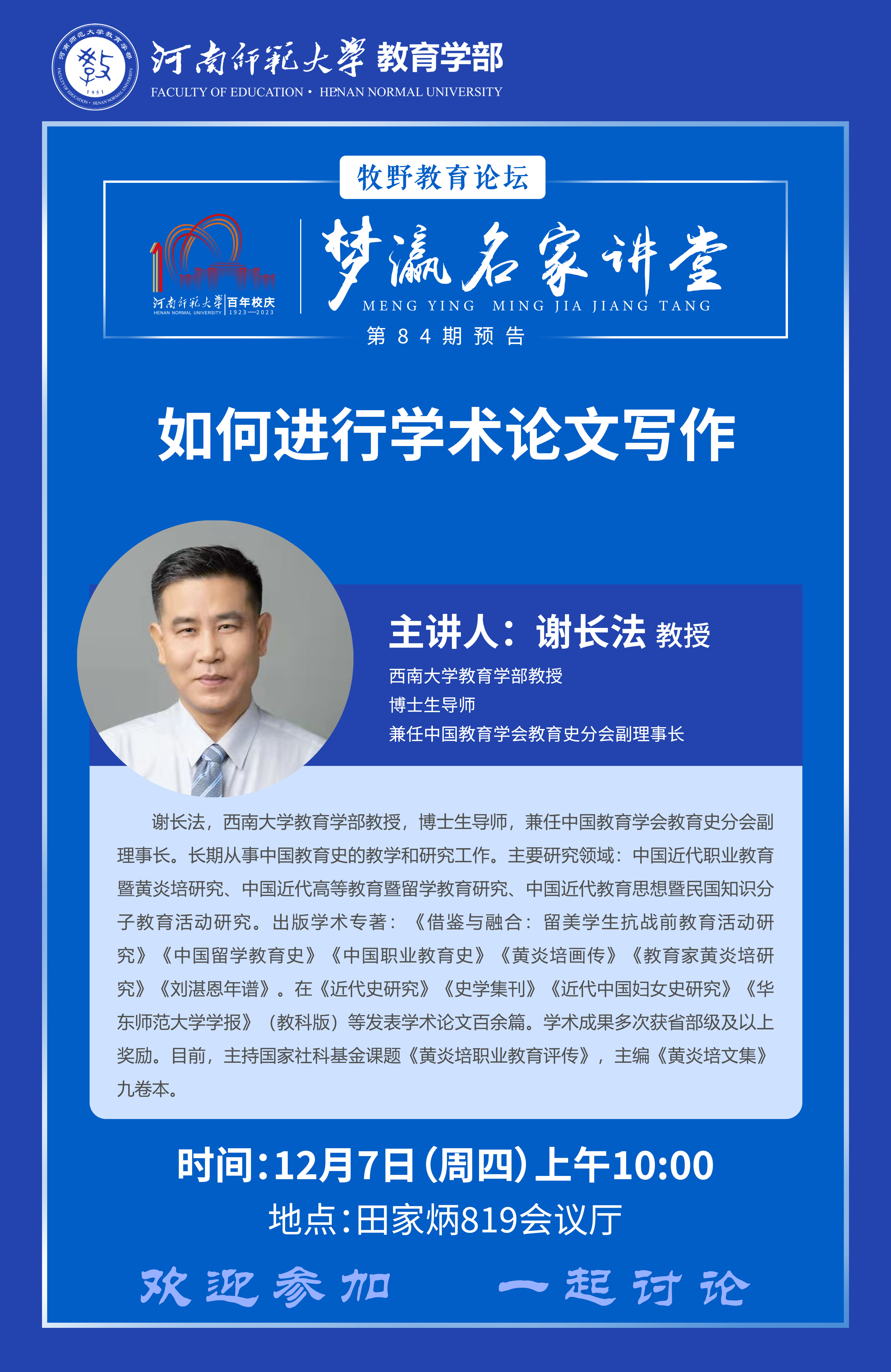 西南大学谢长法教授将应邀做客百年校庆之梦瀛名家讲堂