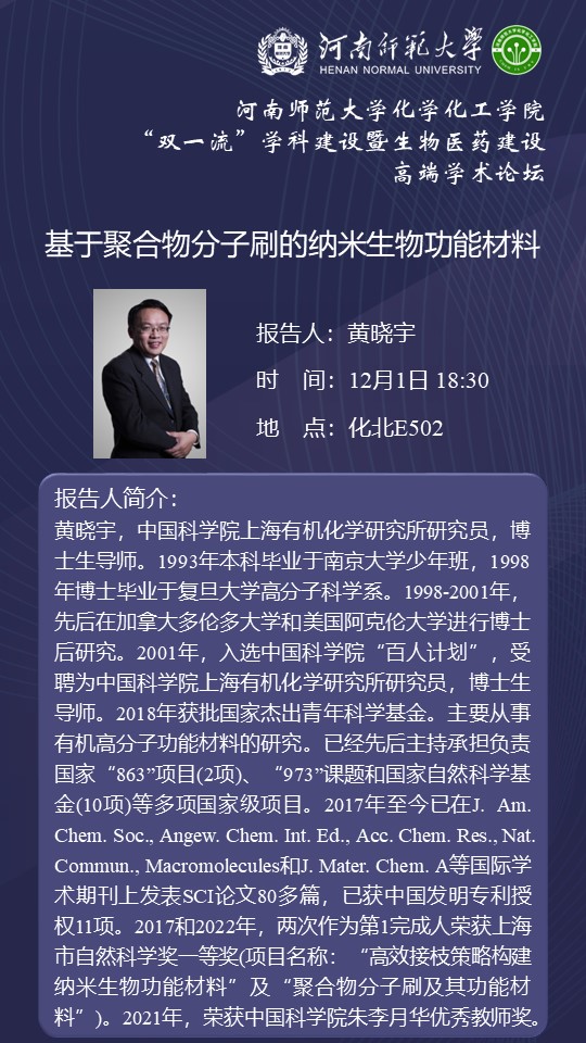 中科院上海有机化学研究所黄晓宇研究员将应邀做客百年校庆之“俊甫”讲坛