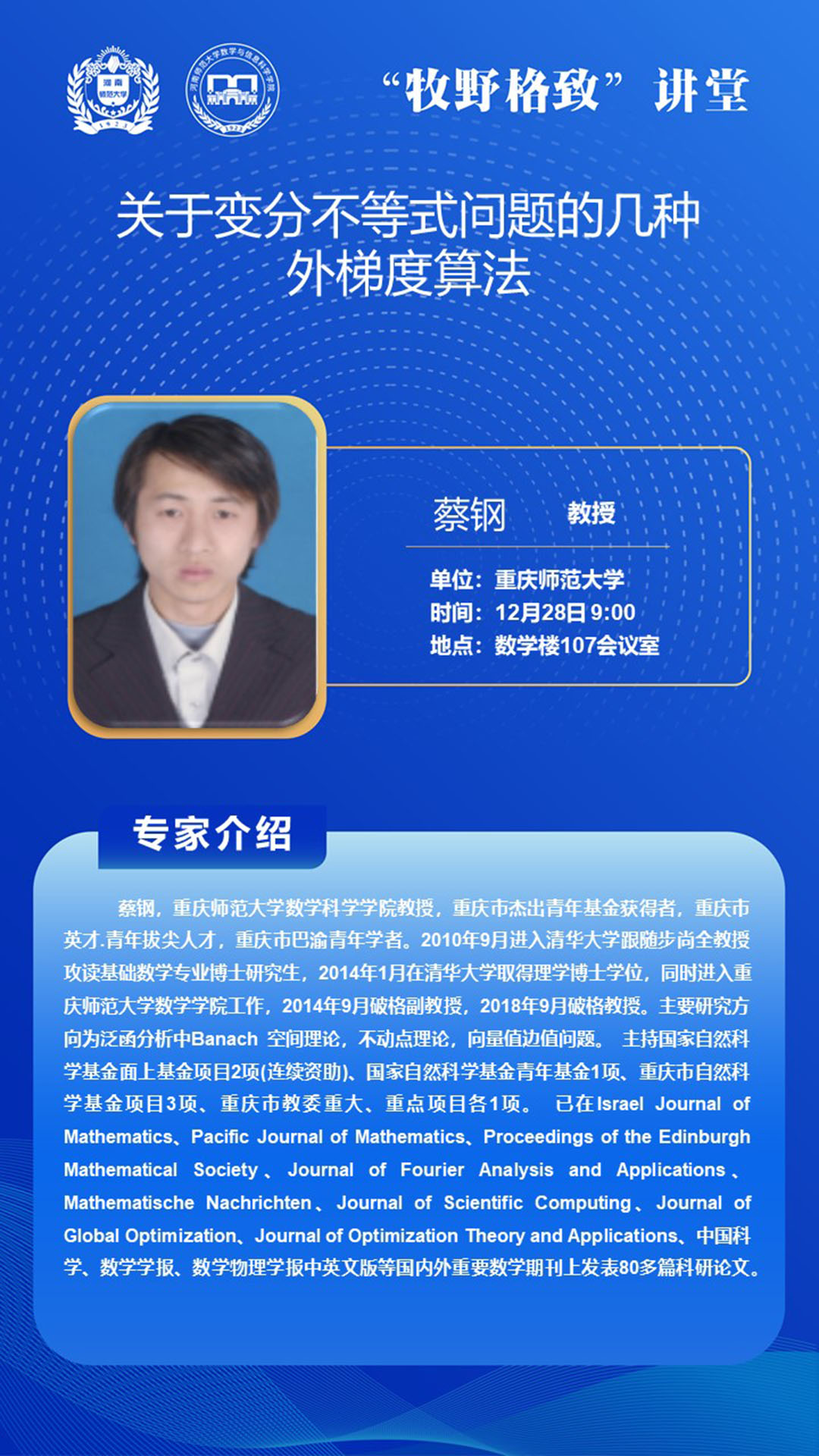 重庆师范大学蔡钢教授将应邀做客百年校庆之“牧野格致”讲堂