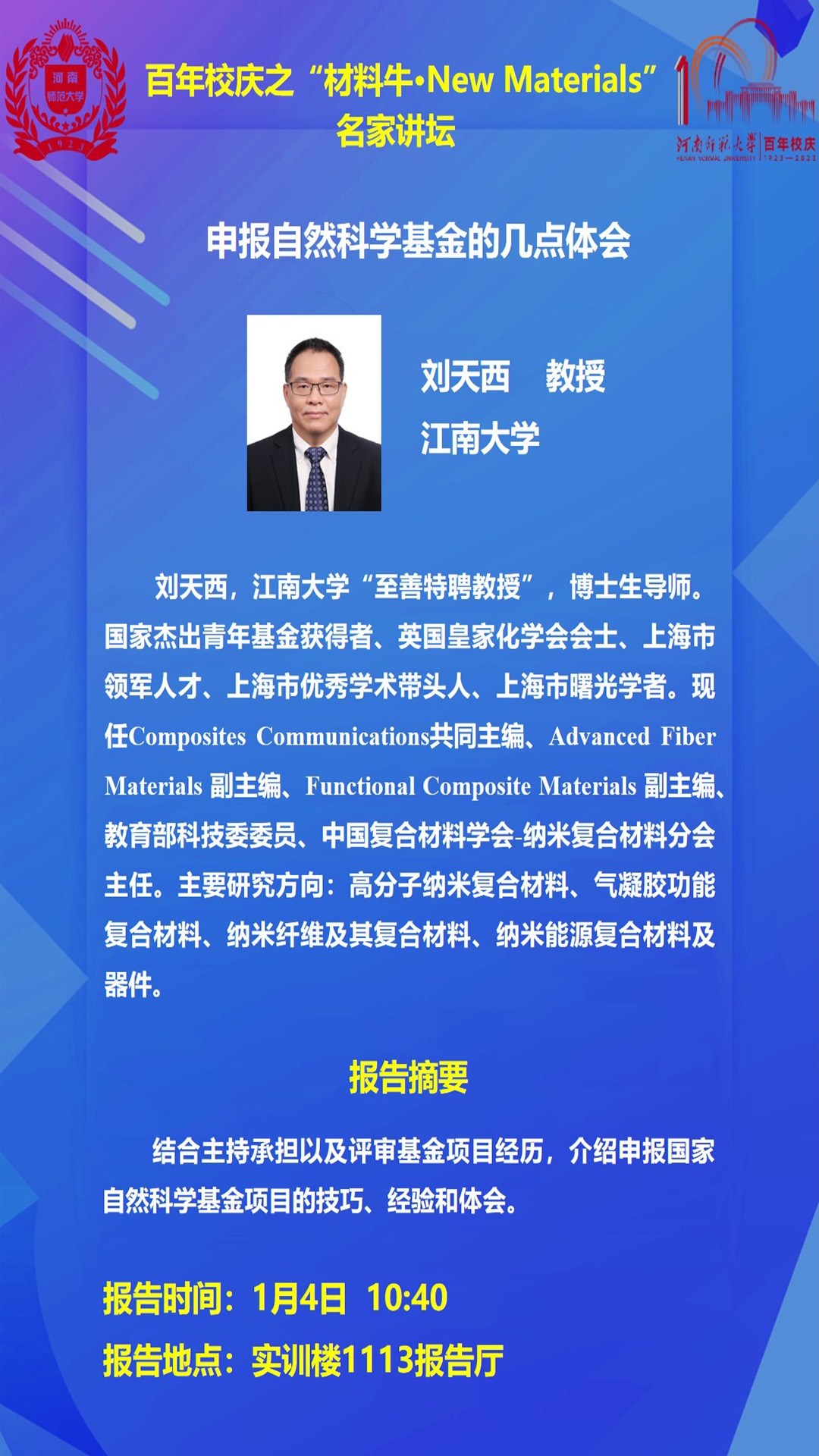 江南大学刘天西教授将应邀做客百年校庆之“材料牛·NewMaterials"名家讲坛