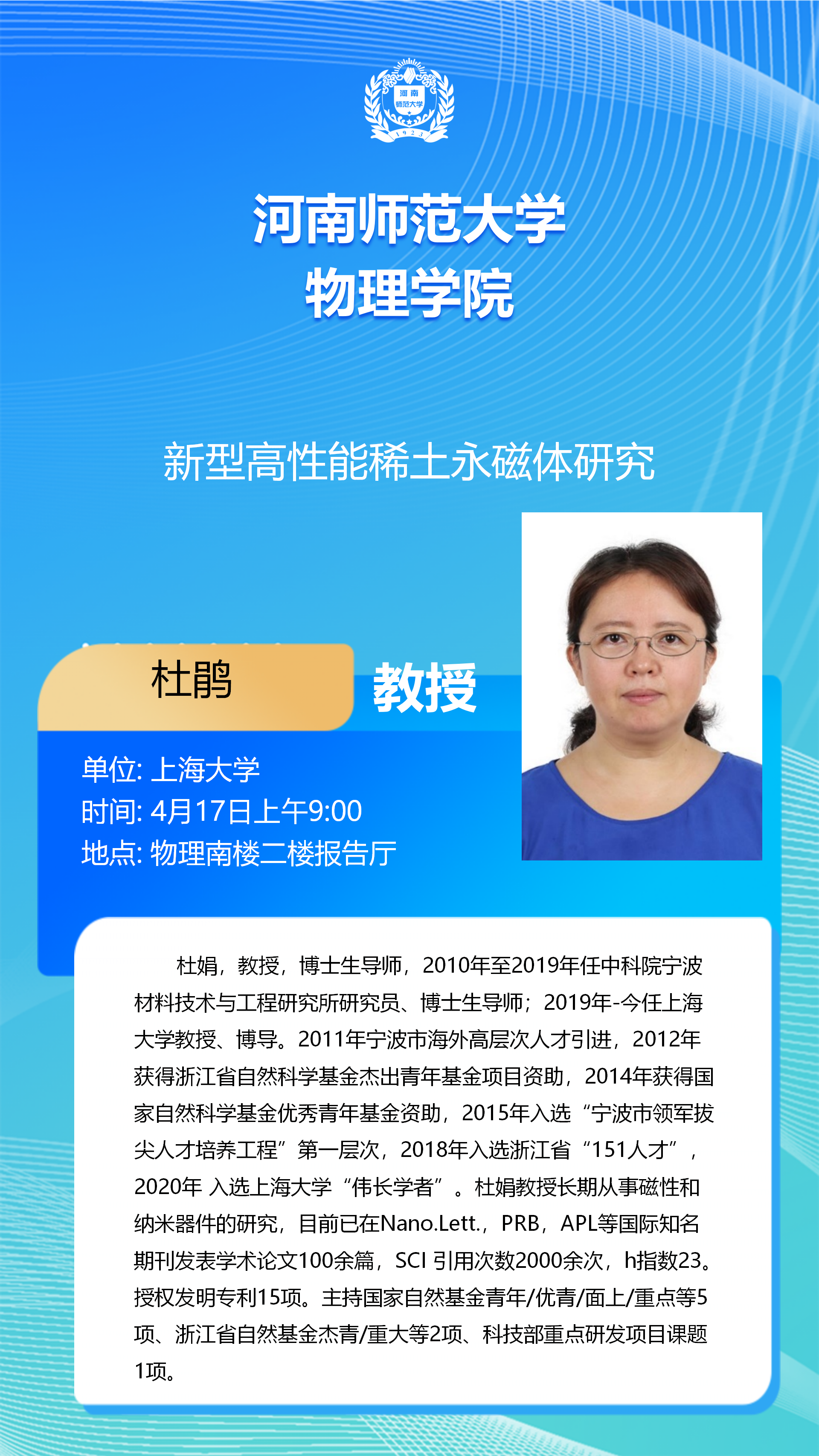 上海大学杜鹃教授将应邀做客“八角楼”讲坛