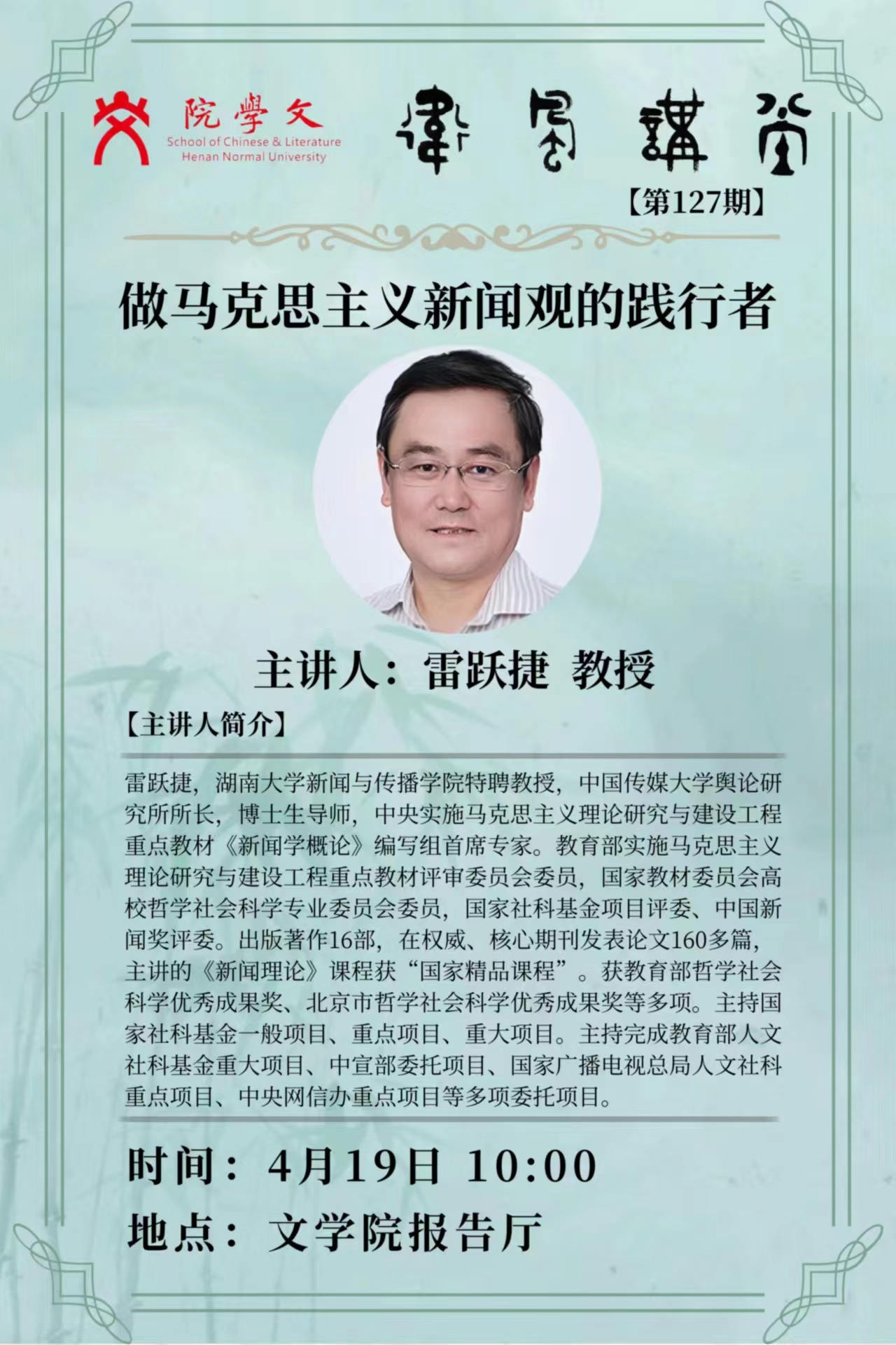 湖南大学特聘教授雷跃捷将应邀做客“卫风讲堂”