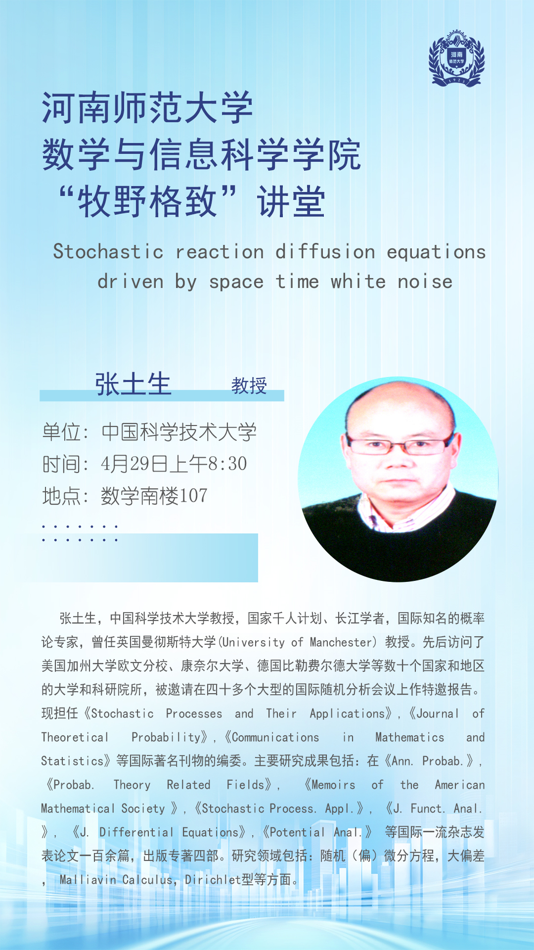 中国科学技术大学张土生教授将应邀做客“牧野格致”讲堂