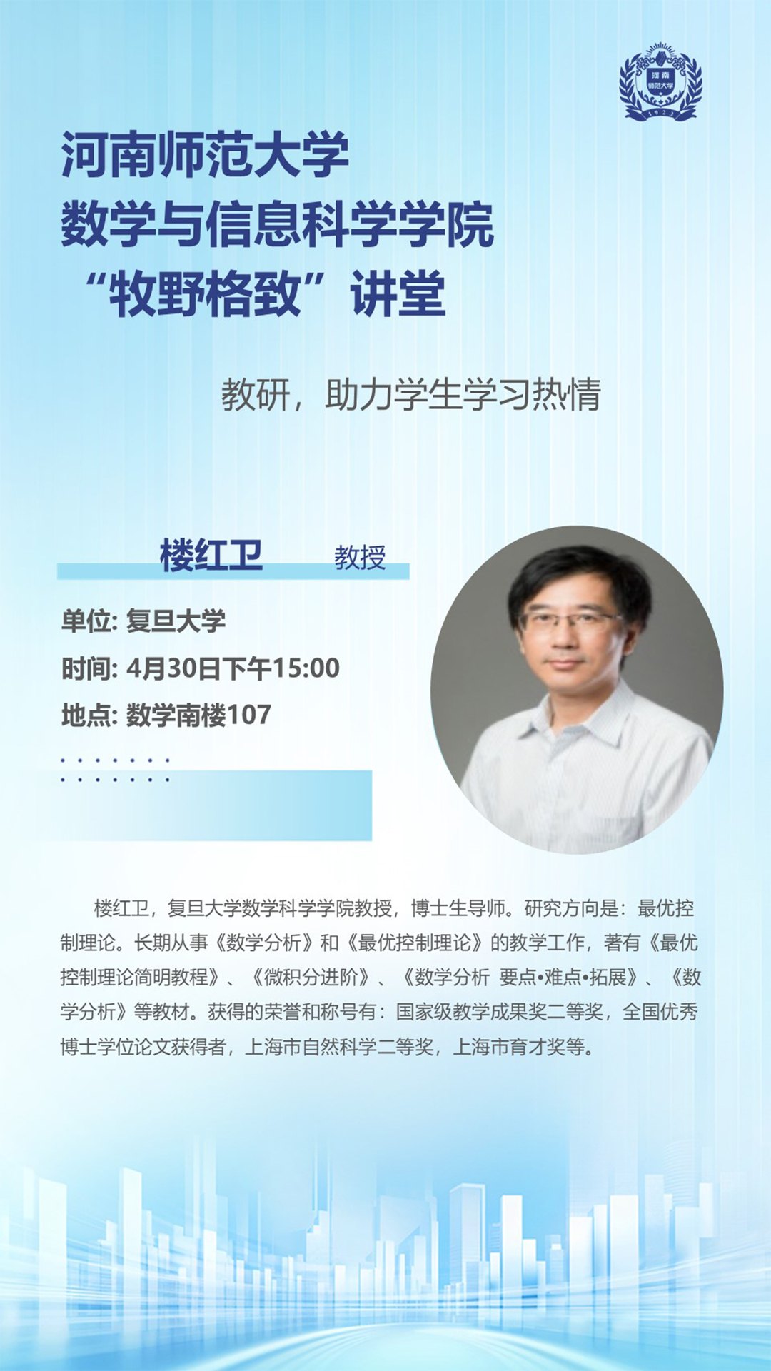 复旦大学楼红卫教授将应邀做客“牧野格致”讲堂