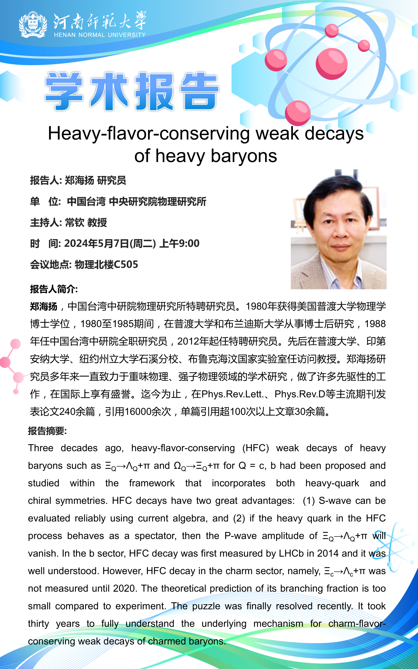 中国台湾中央研究院物理研究所郑海扬研究员将应邀做客“八角楼”讲坛