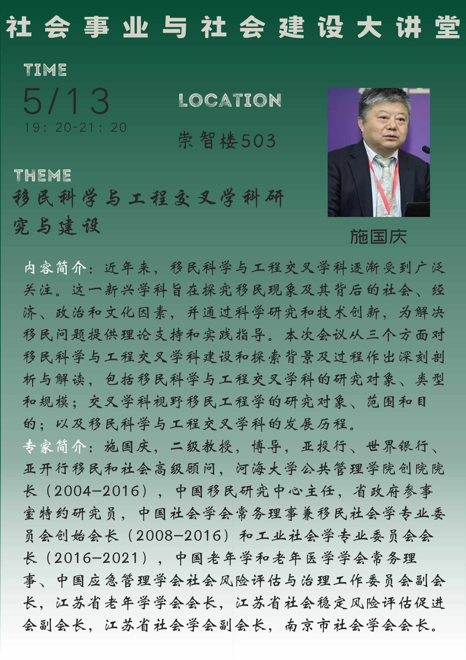 河海大学施国庆教授将应邀做客社会事业与社会建设大讲堂