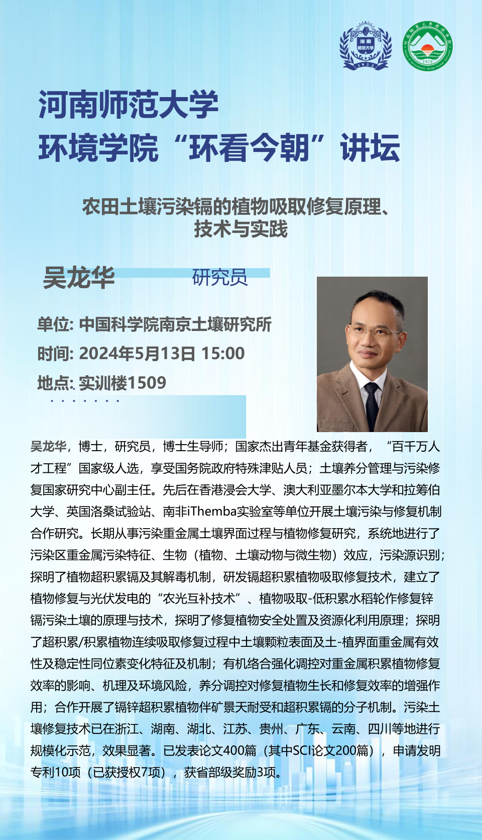 中国科学院南京土壤研究所吴龙华研究员将应邀做客“环看今朝”讲坛