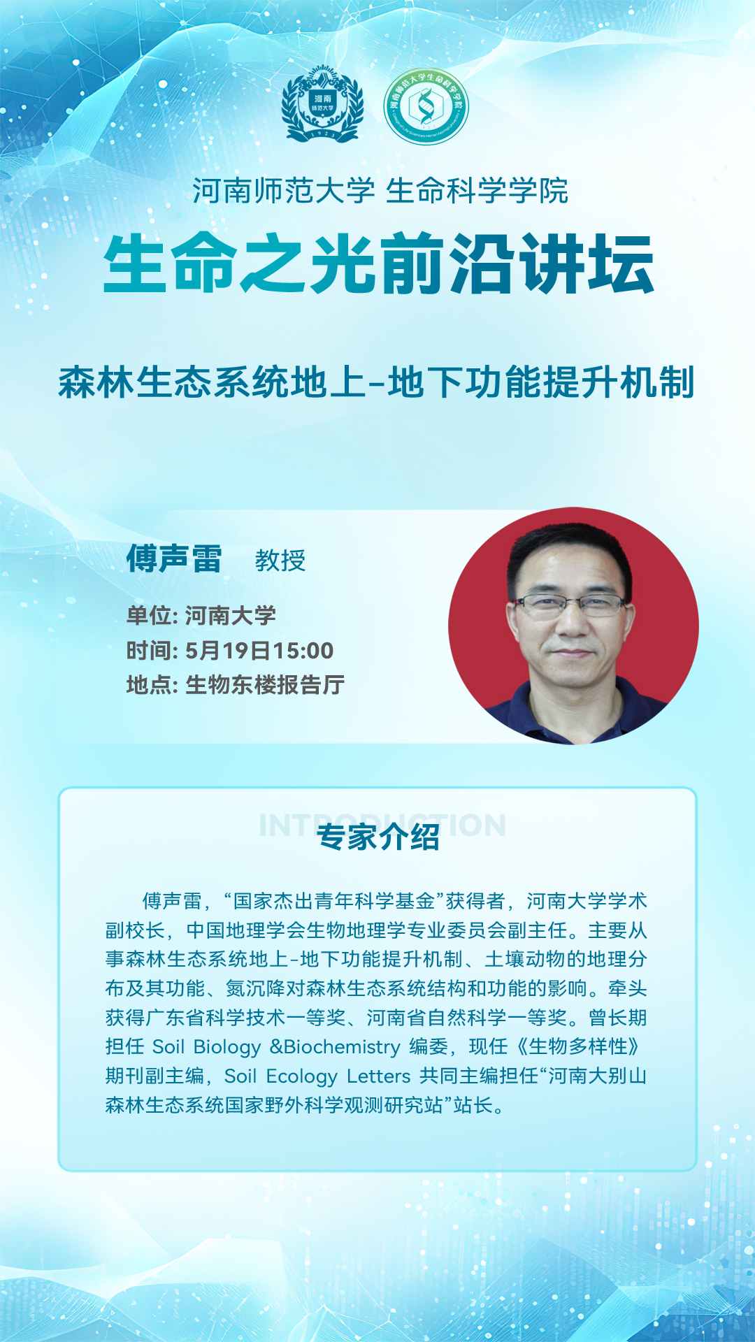 河南大学傅声雷教授将应邀做客“生命之光前沿讲坛”