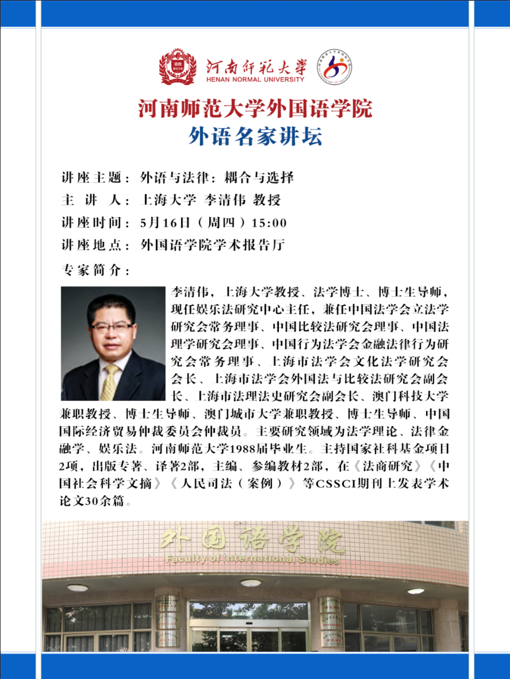 上海大学李清伟教授将应邀做客外语名家讲坛