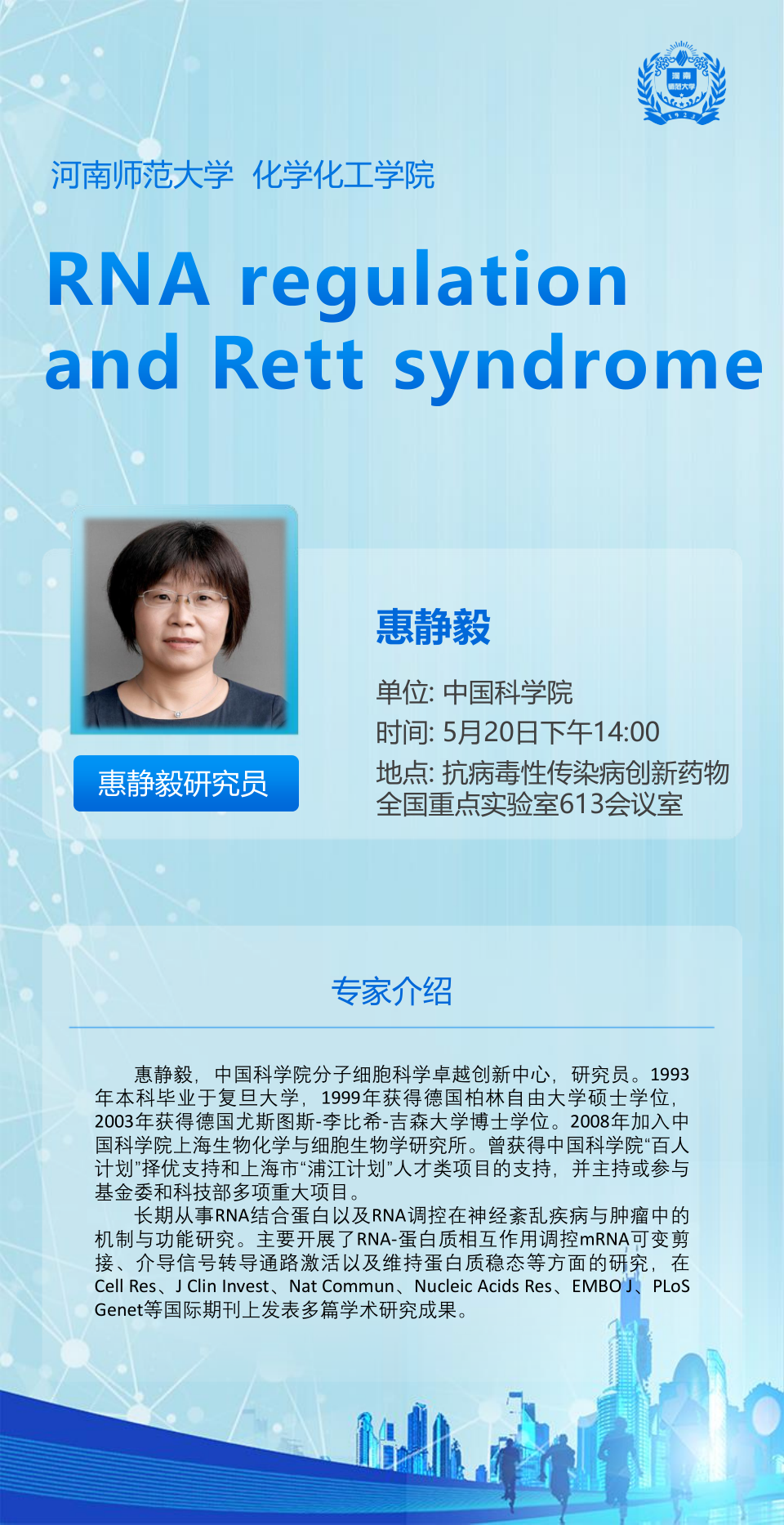 中国科学院分子细胞科学卓越创新中心惠静毅研究员将应邀做客“俊甫讲堂”