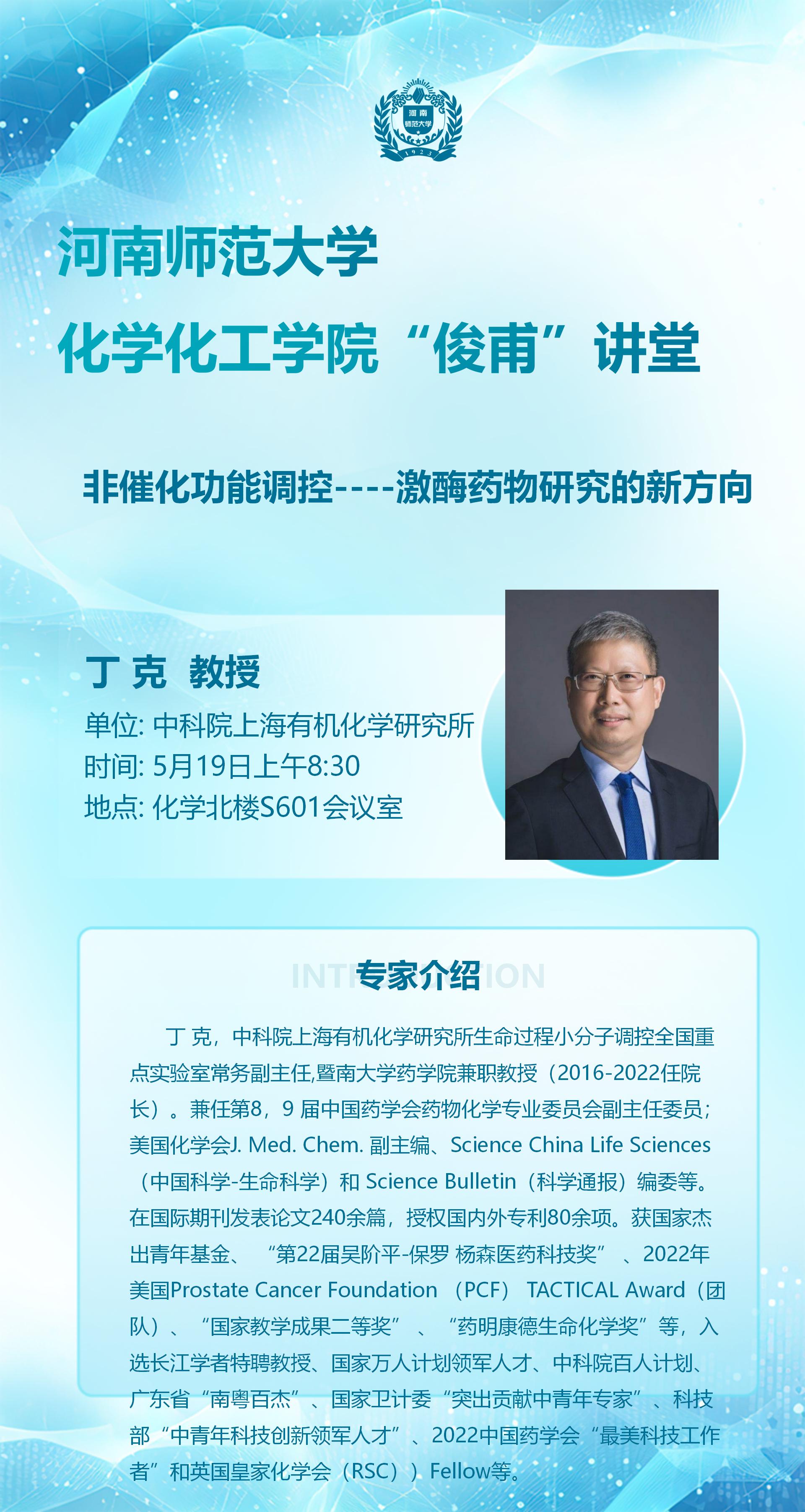 中国科学院上海有机化学研究所丁克教授将应邀做客“俊甫讲堂”
