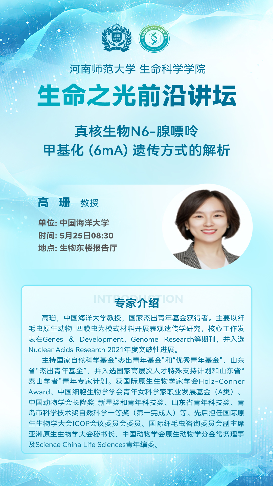 中国海洋大学高珊教授将应邀做客“生命之光前沿讲坛”