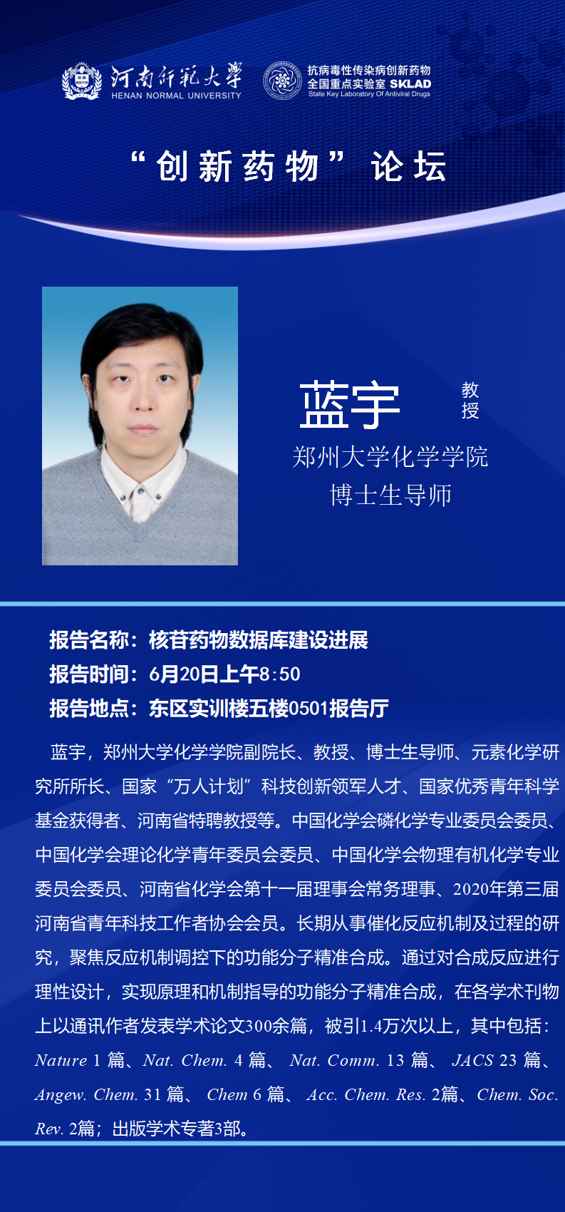 郑州大学蓝宇教授将应邀做客“创新药物”论坛