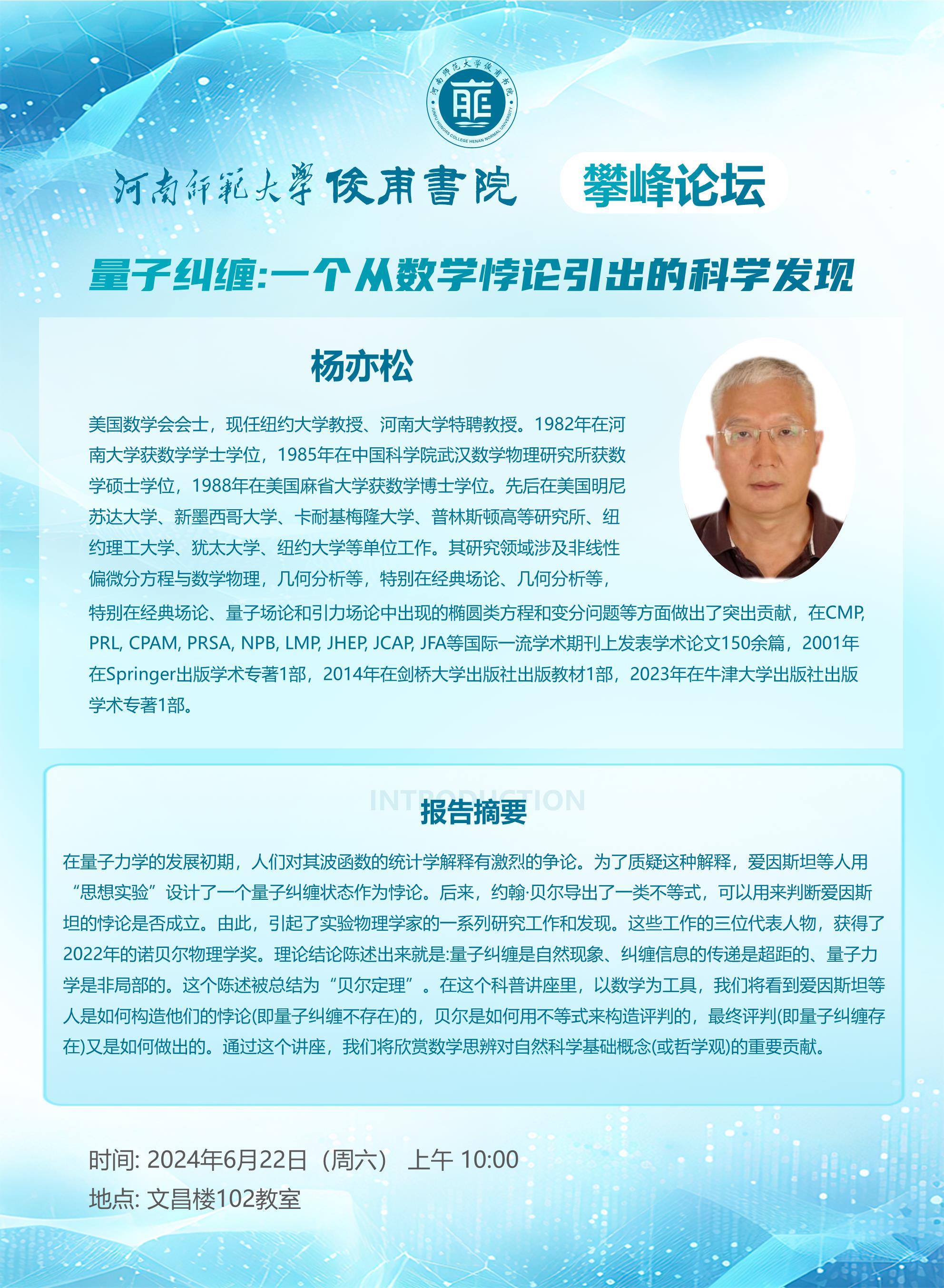 美国纽约大学杨亦松教授将应邀做客“攀峰论坛”