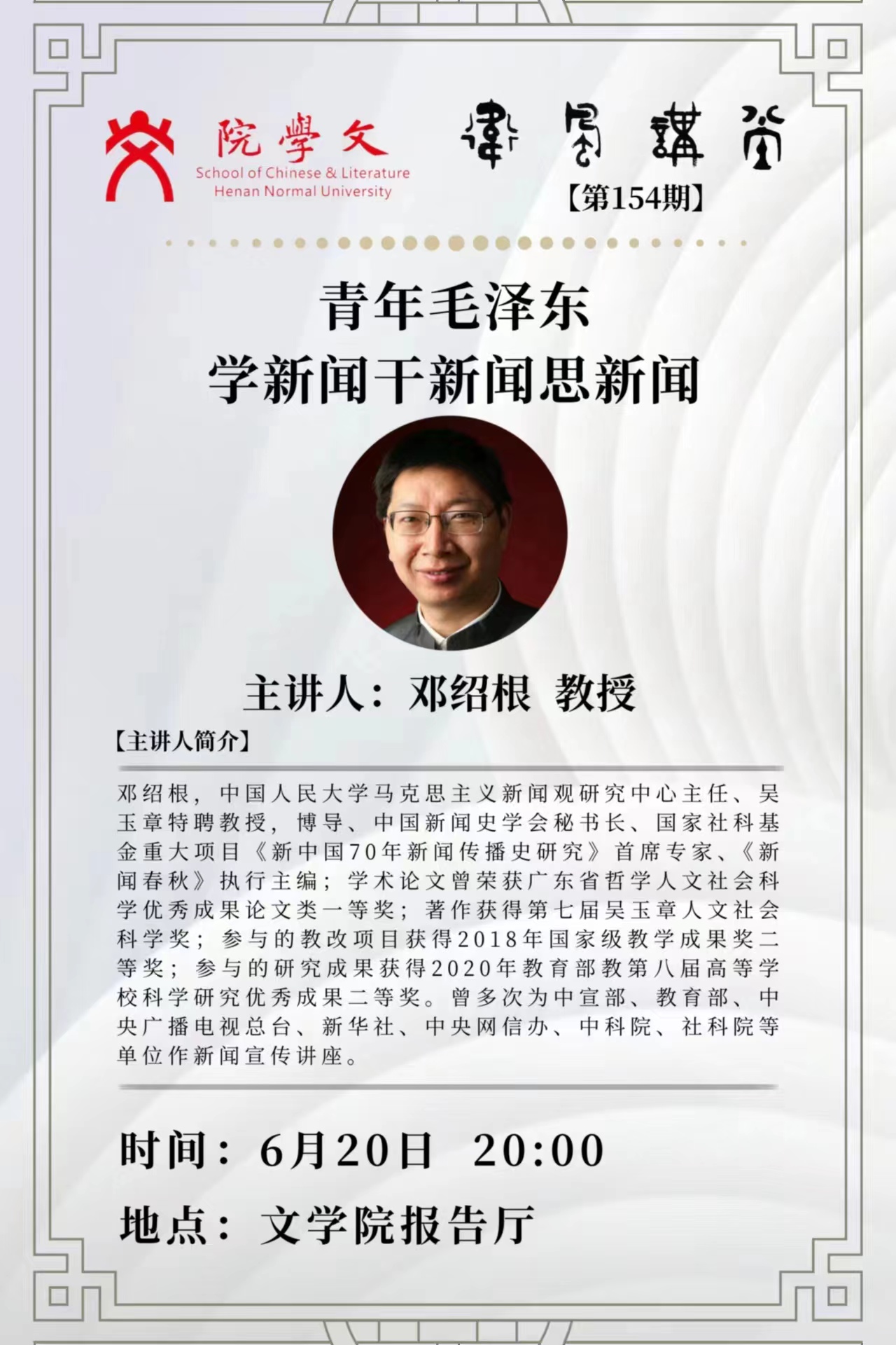 中国人民大学邓绍根教授将应邀做客“卫风讲堂”