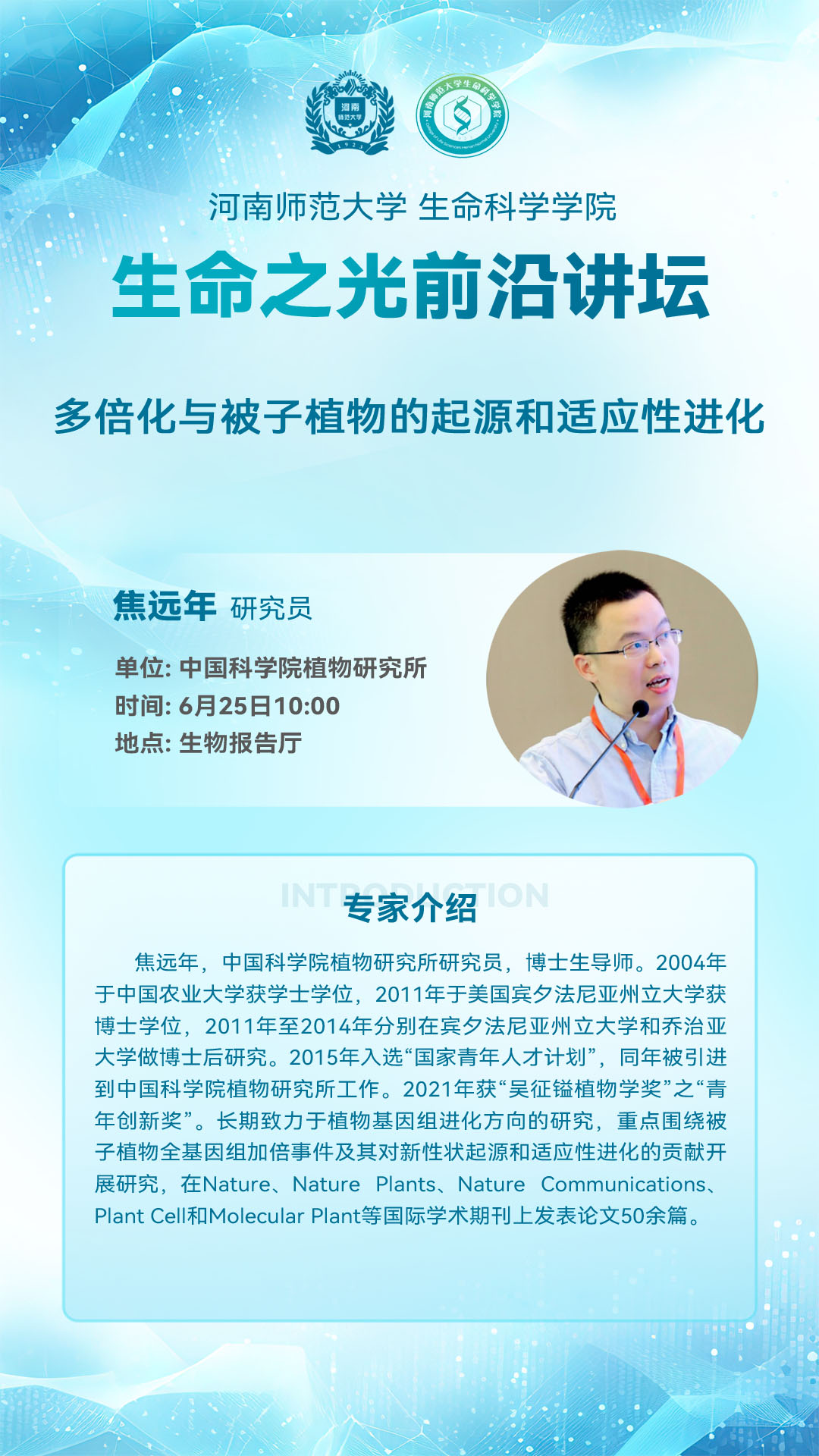 中国科学院植物研究所焦远年研究员将应邀做客“生命之光前沿讲坛”