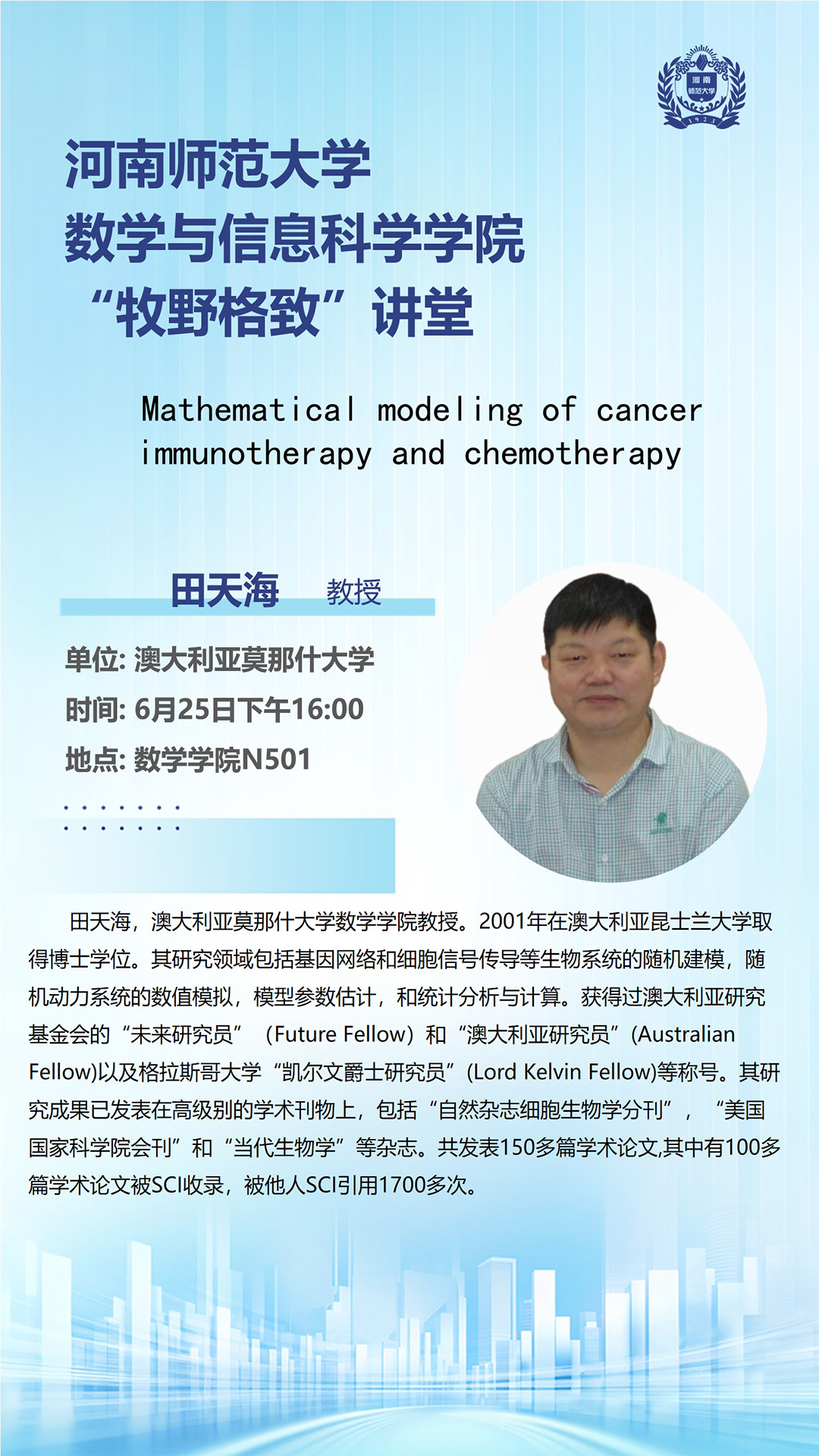 澳大利亚莫那什大学田天海教授将应邀做客“牧野格致”讲堂
