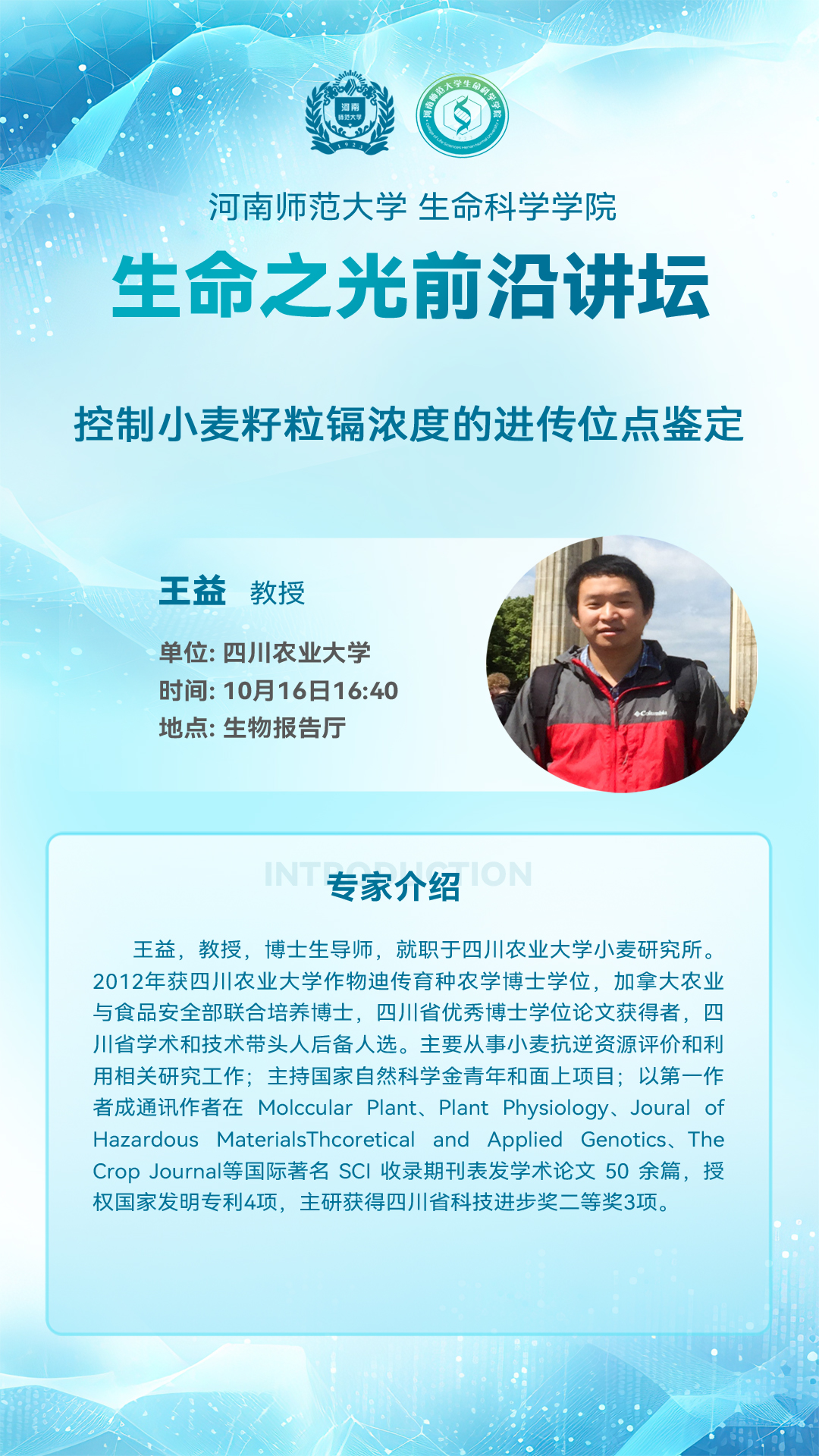 四川农业大学王益教授将应邀做客“生命之光前沿讲坛”