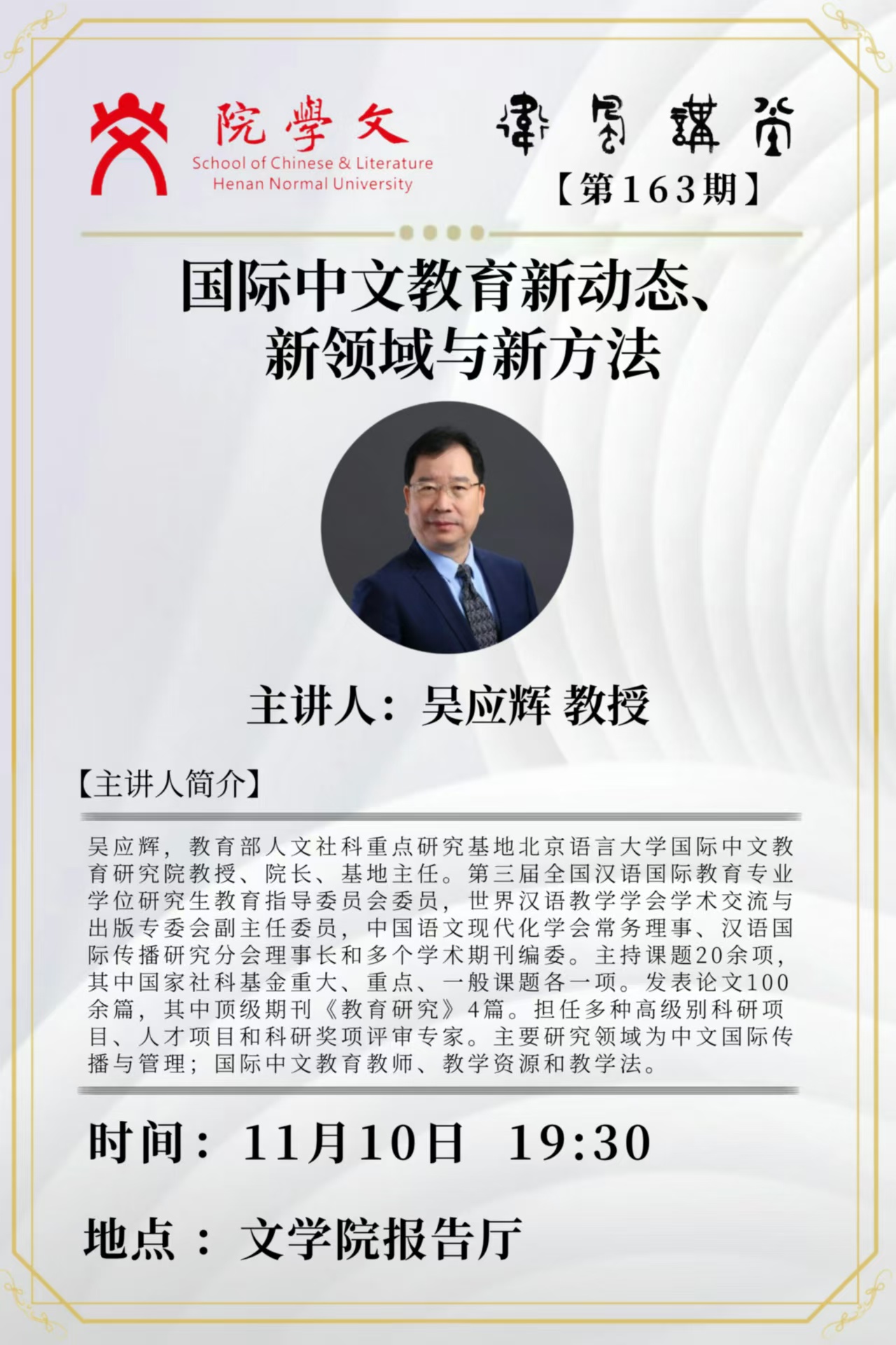 北京语言大学吴应辉教授将应邀做客“卫风讲堂”
