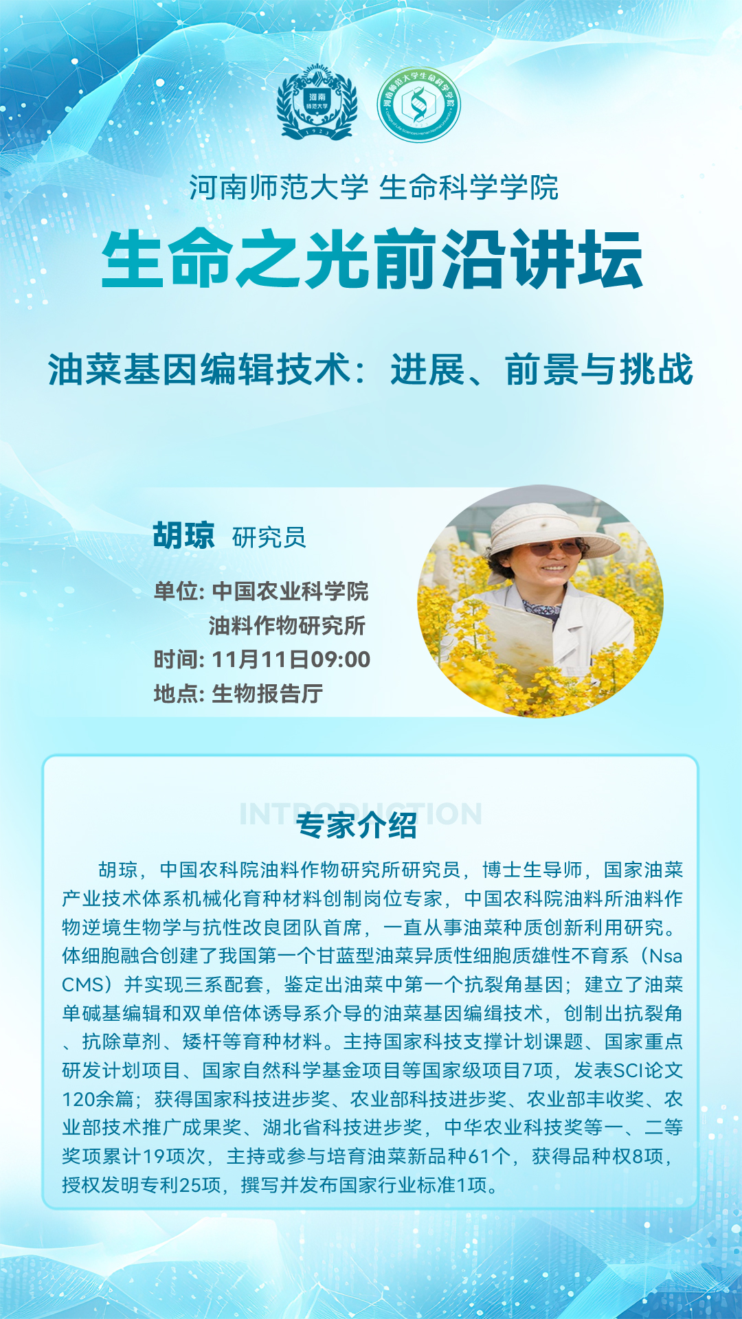 中国农业科学院油料作物研究所胡琼研究员将应邀做客“生命之光前沿讲坛”