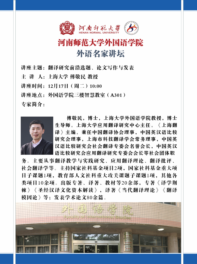上海大学傅敬民教授将应邀做客外语名家讲坛