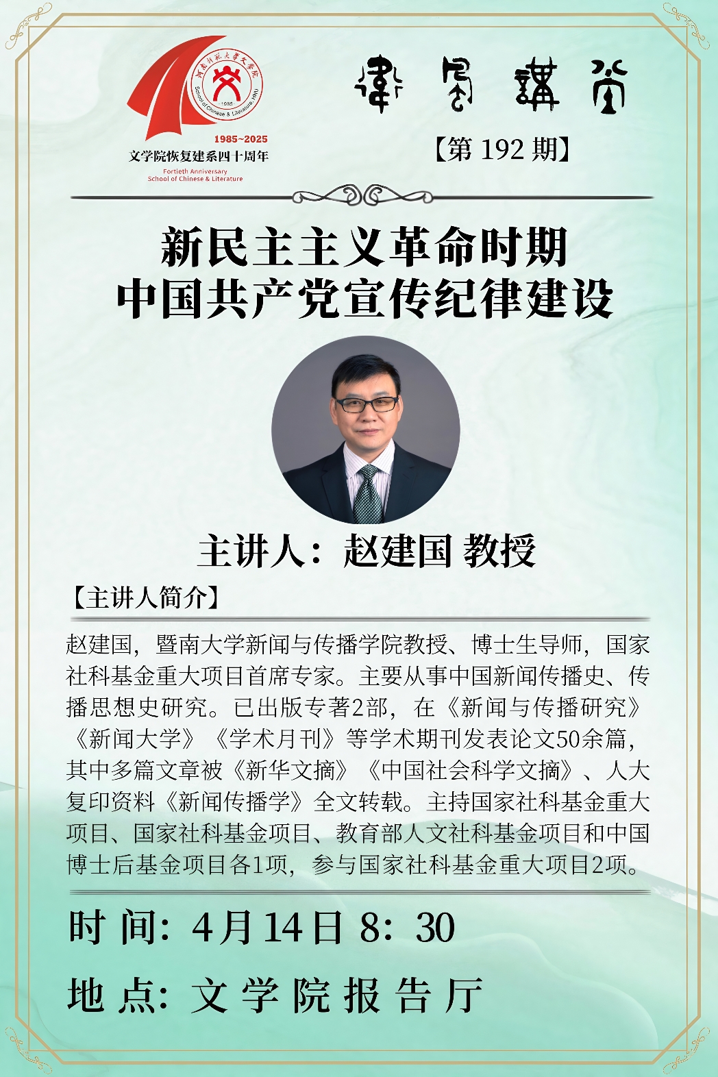 暨南大学赵建国教授将应邀做客“卫风讲堂”