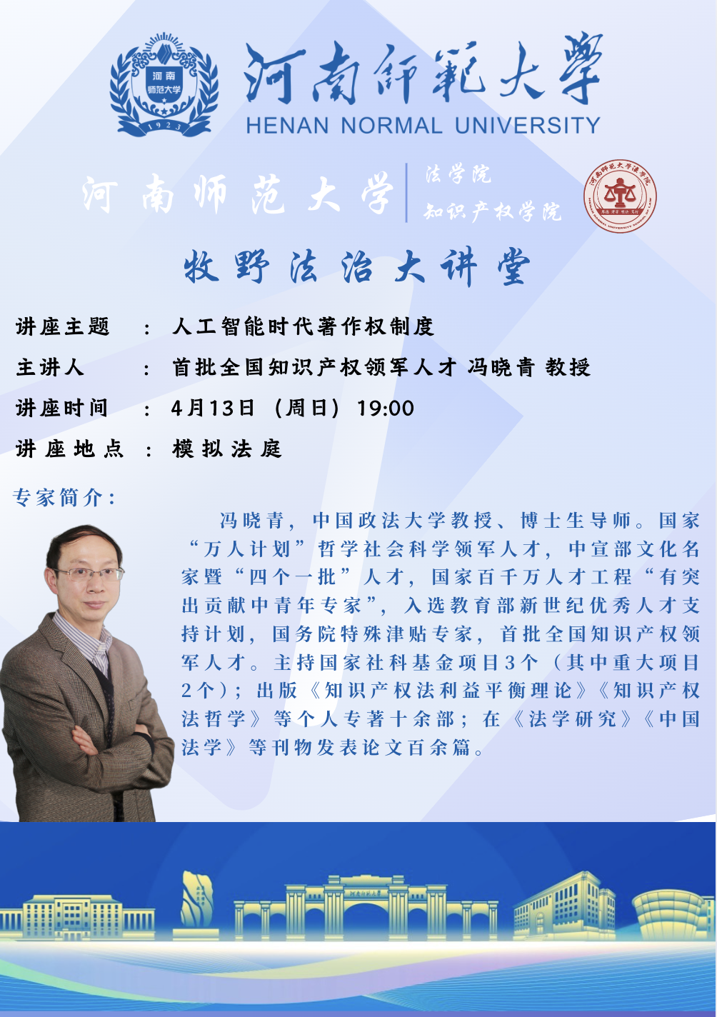 中国政法大学冯晓青教授将应邀做客“牧野法治大讲堂”
