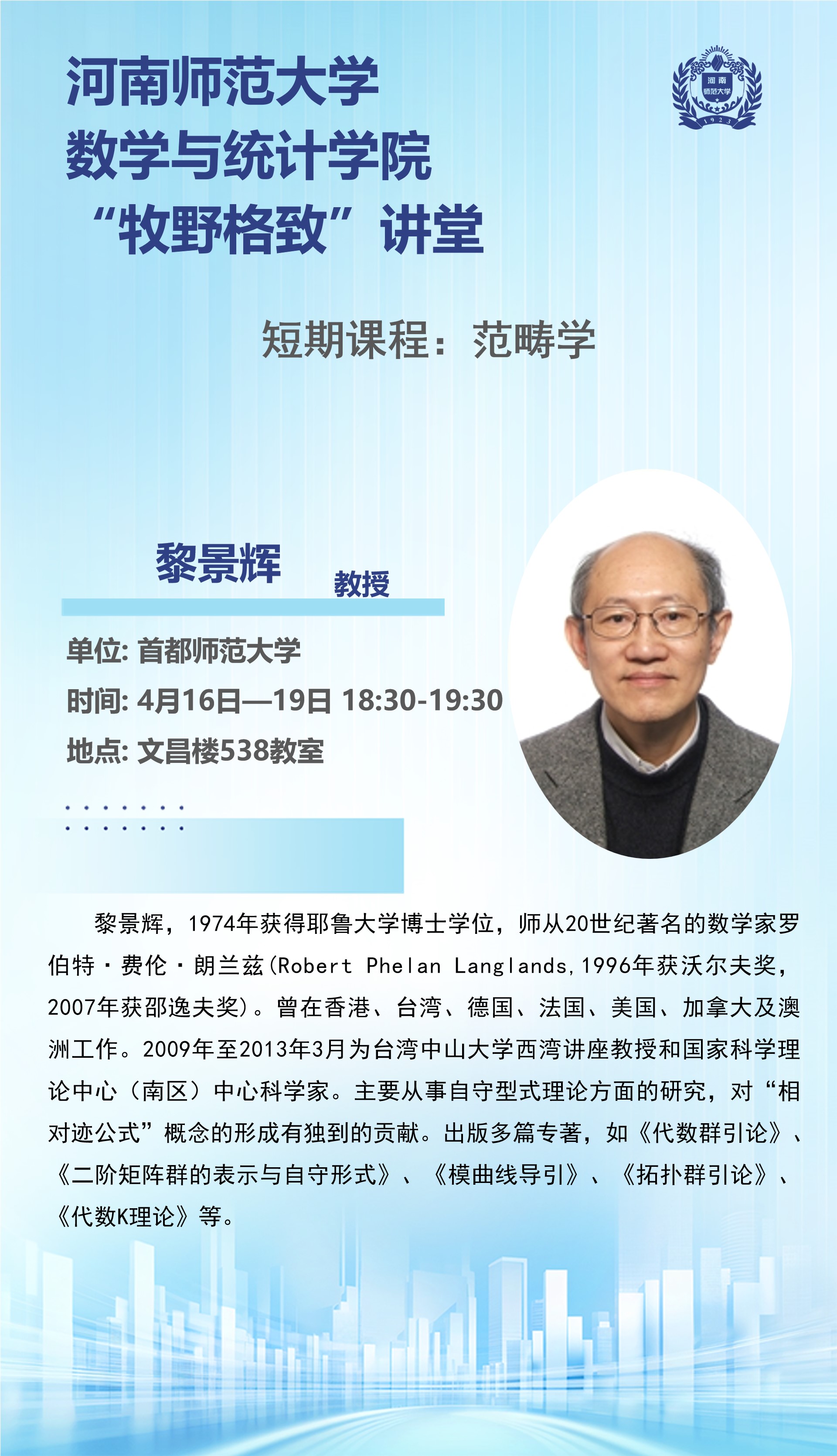 首都师范大学黎景辉教授将应邀做客“牧野格致”讲堂