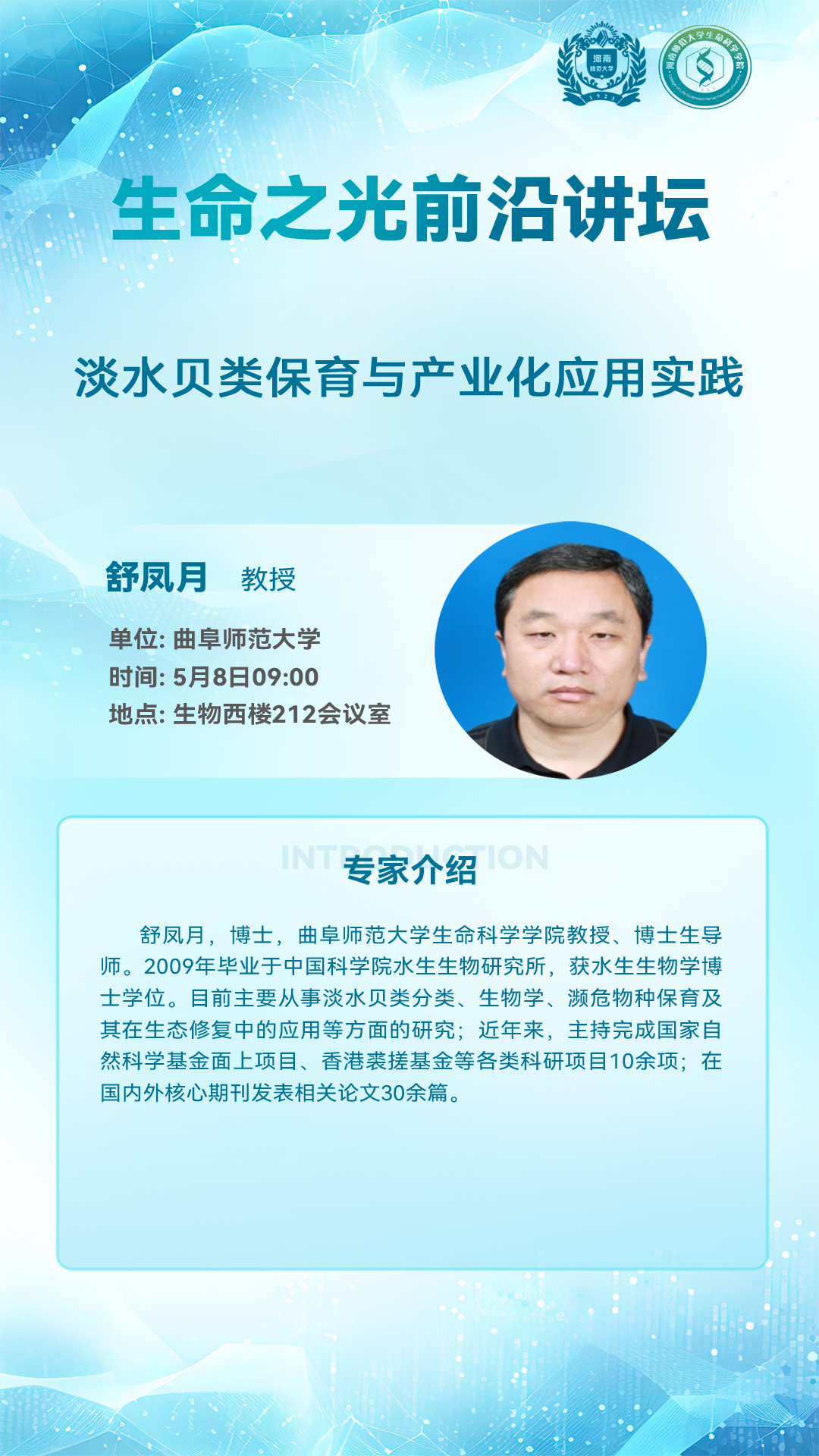 曲阜师范大学舒凤月教授将应邀做客“生命之光前沿讲坛”