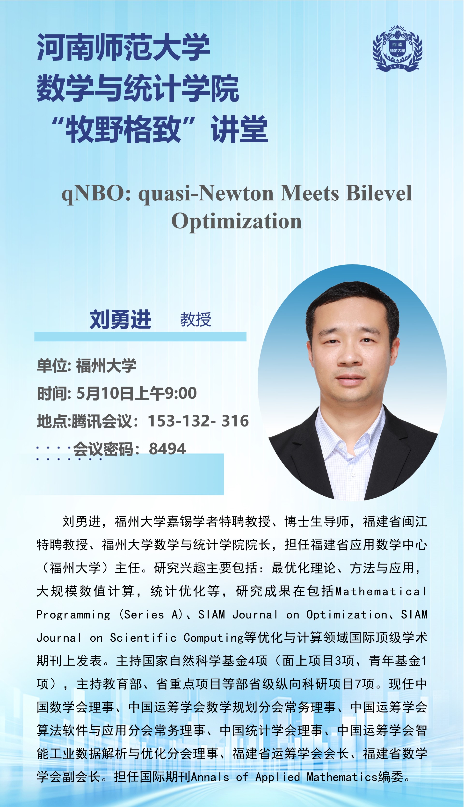 福州大学刘勇进教授将应邀做客“牧野格致”讲堂
