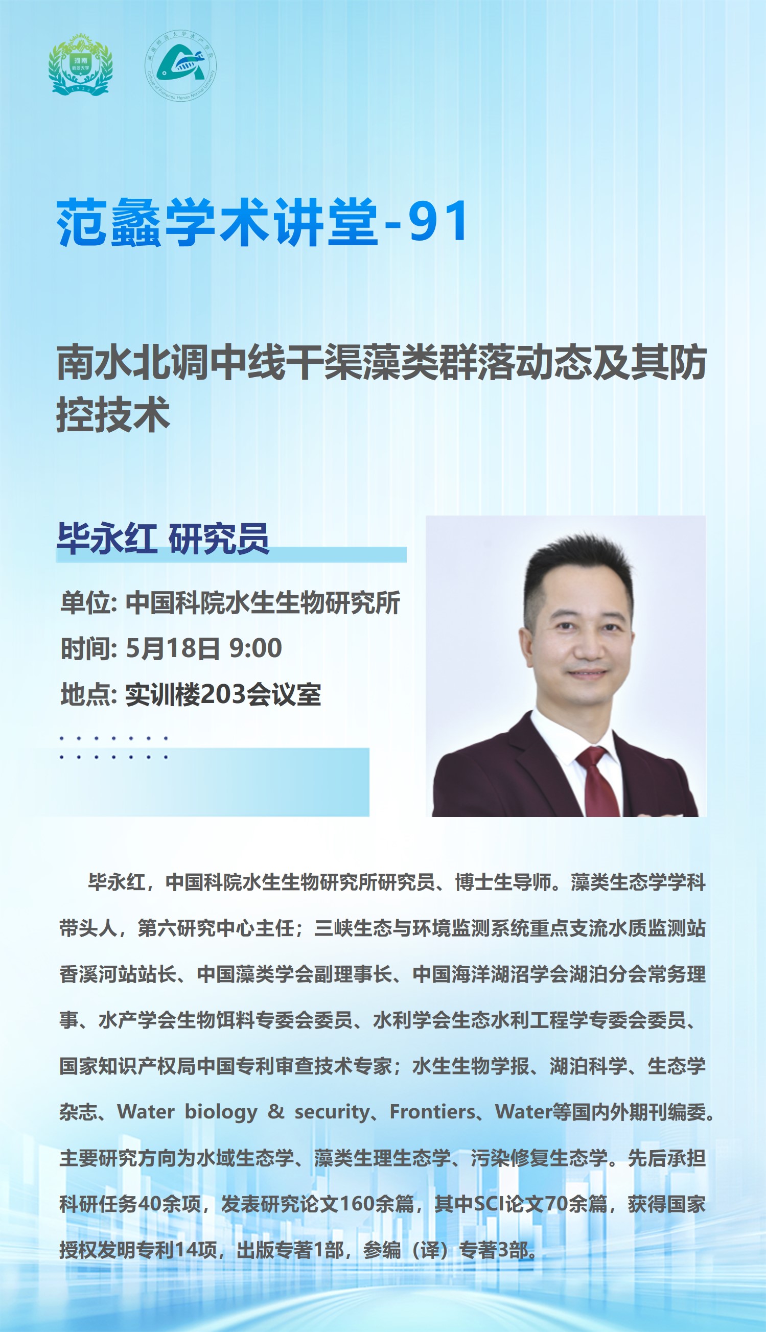 中国科院水生生物研究所毕永红研究员将应邀做客“范蠡学术讲堂”