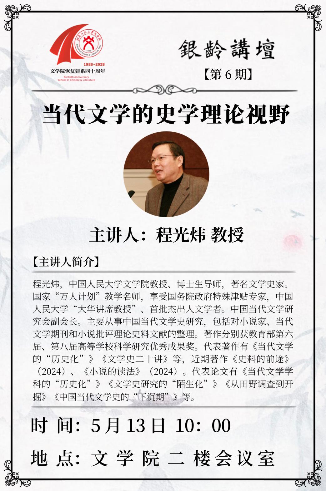中国人民大学程光炜教授将应邀做客文学院“银龄讲坛”