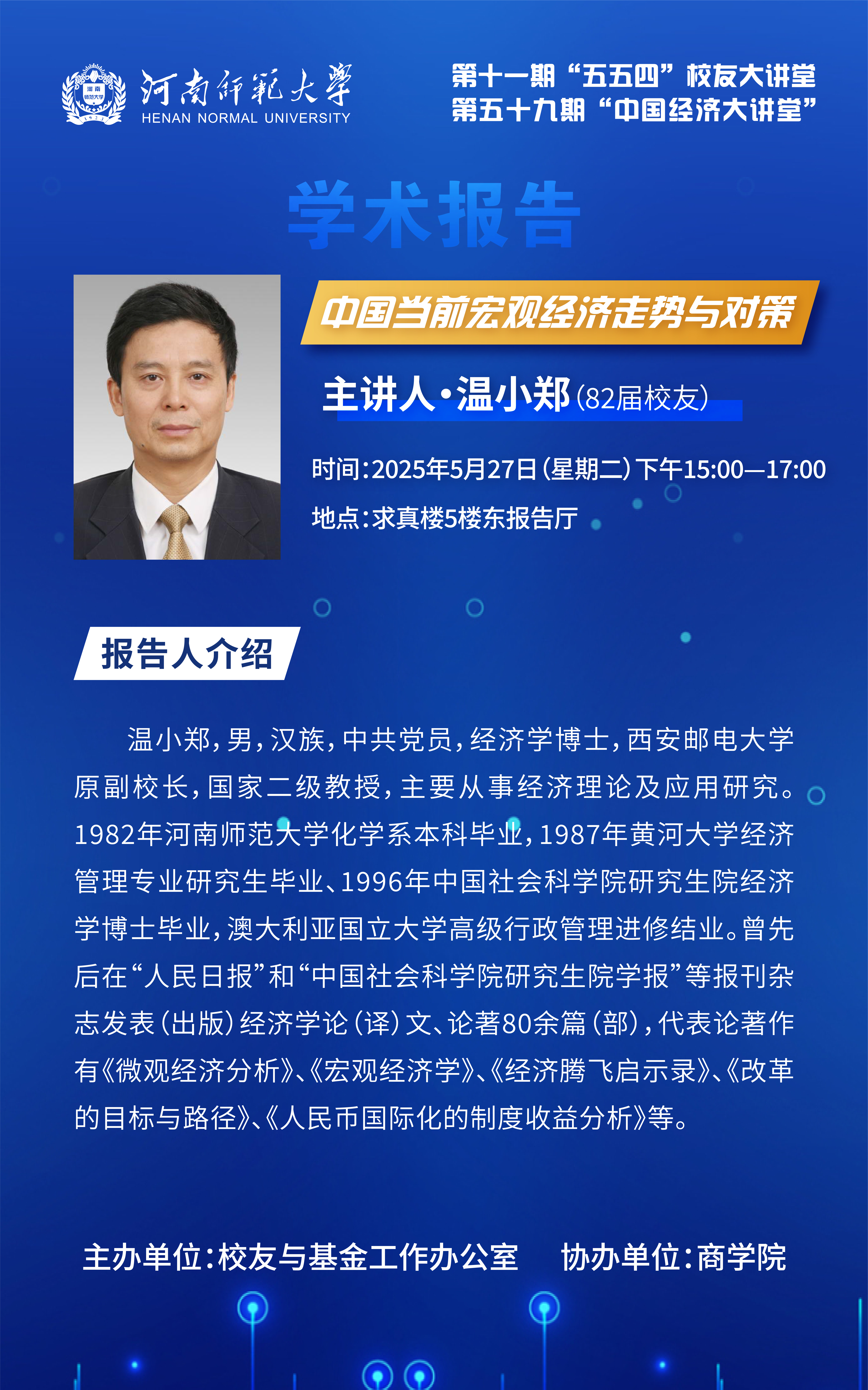 西安邮电大学温小郑教授将应邀做客“五五四”校友大讲堂暨“中国经济大讲堂”