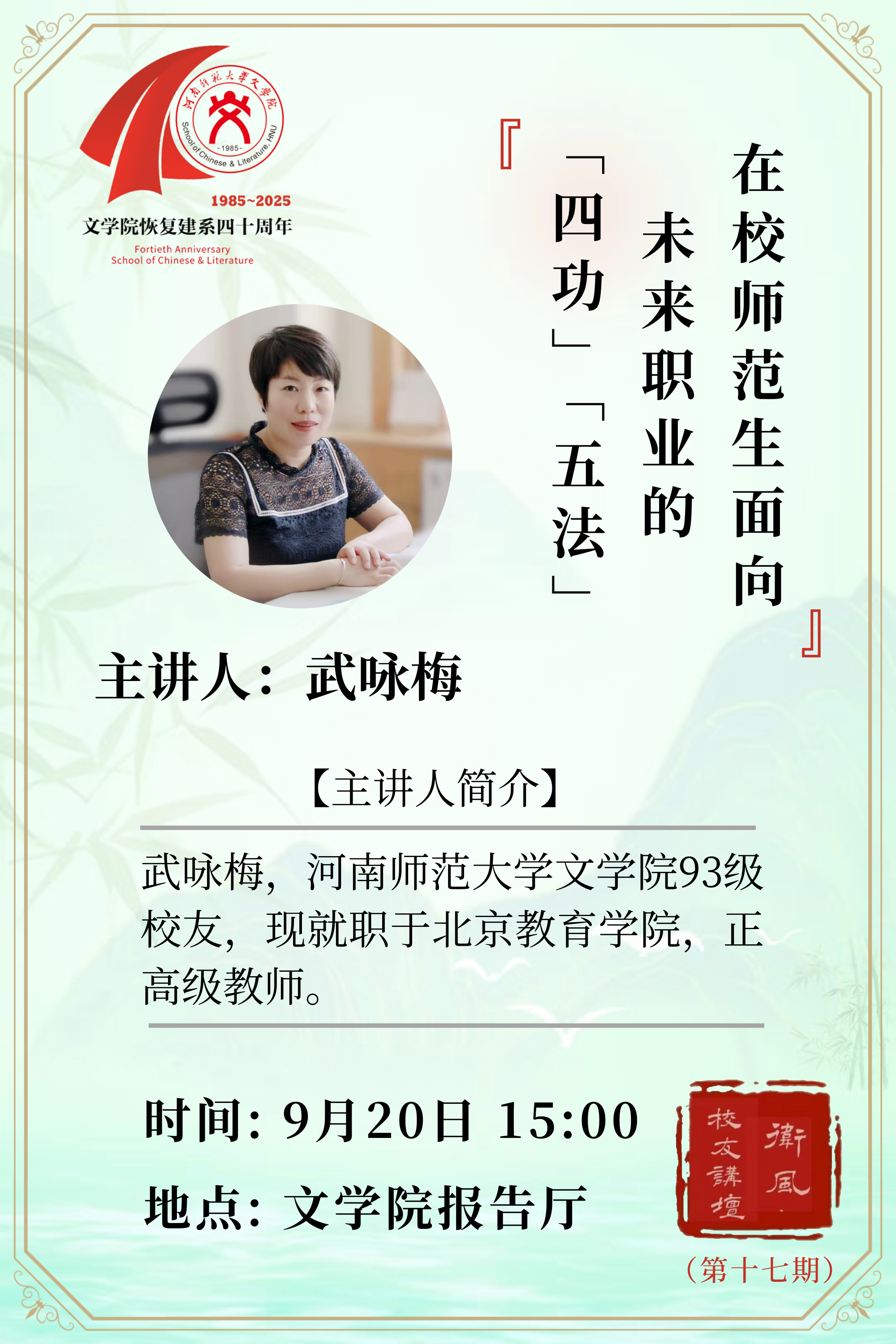 北京教育学院武咏梅将应邀做客“卫风校友讲坛”