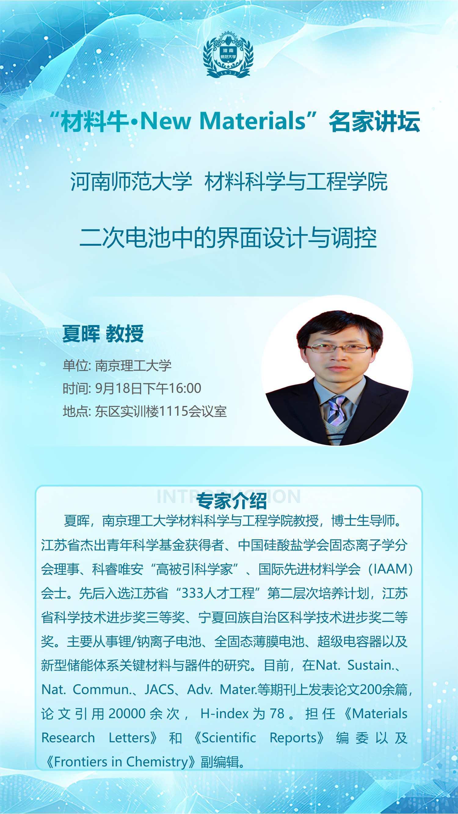 南京理工大学夏晖教授将应邀做客“材料牛·New Materials”名家讲坛
