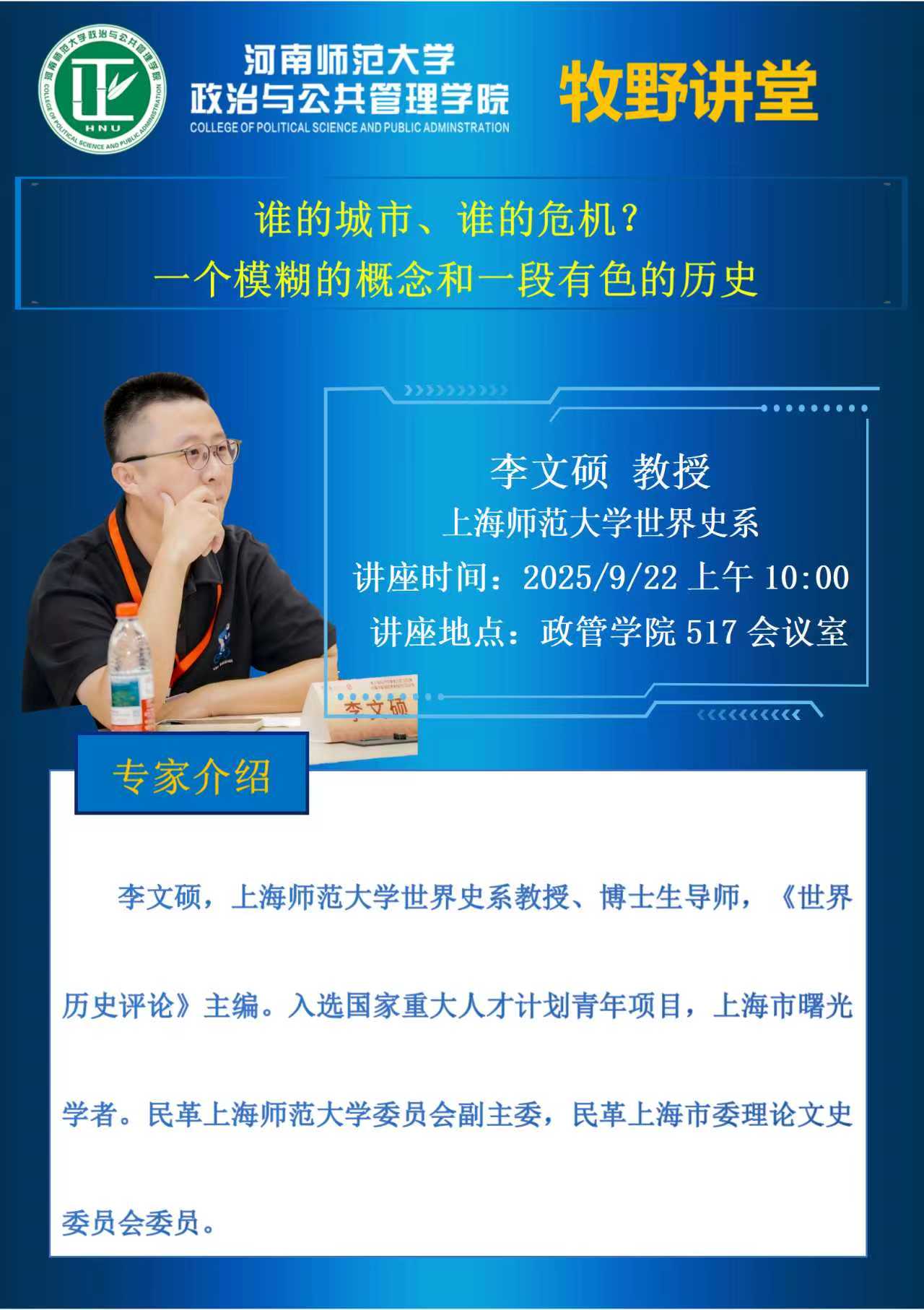 上海师范大学李文硕教授将应邀做客“牧野讲堂”