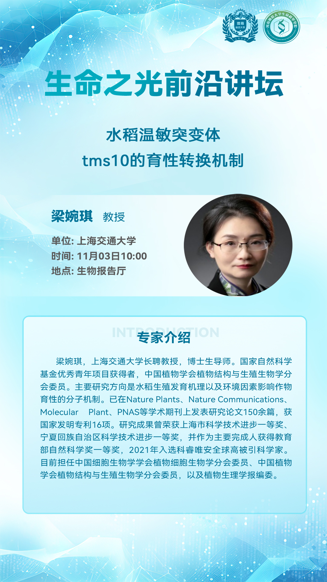 上海交通大学梁婉琪教授将应邀做客“生命之光”前沿讲坛
