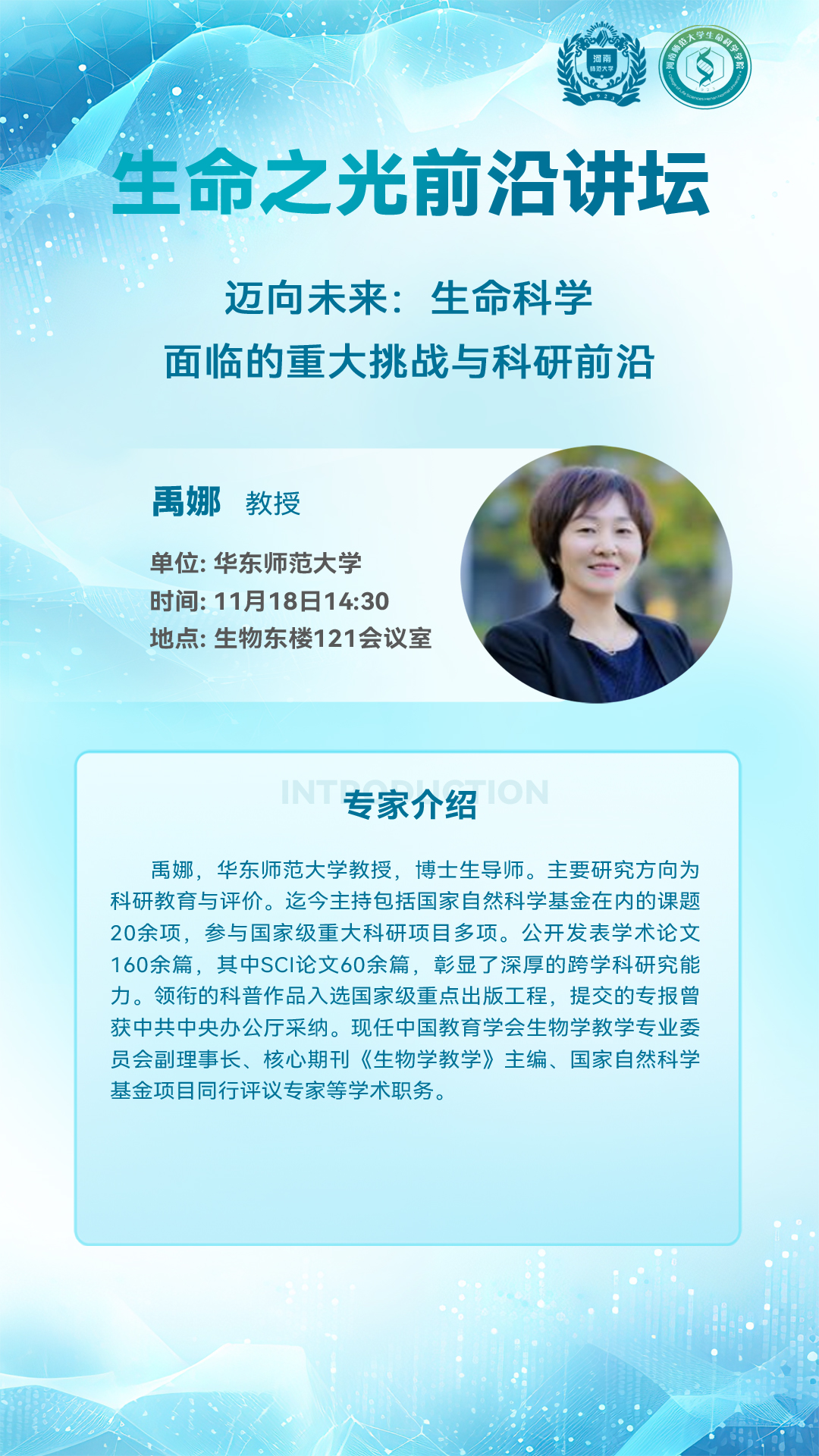 华东师范大学禹娜教授将应邀做客“生命之光”前沿讲坛