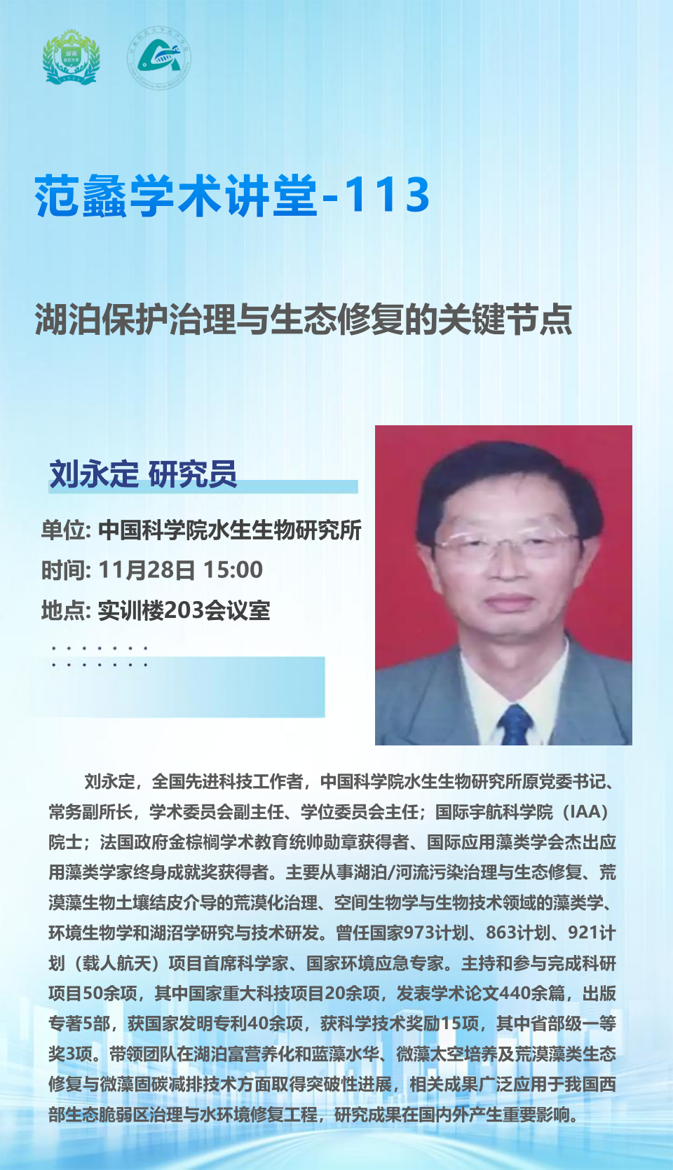 中国科学院水生生物研究所刘永定研究员将应邀做客“范蠡学术讲堂”
