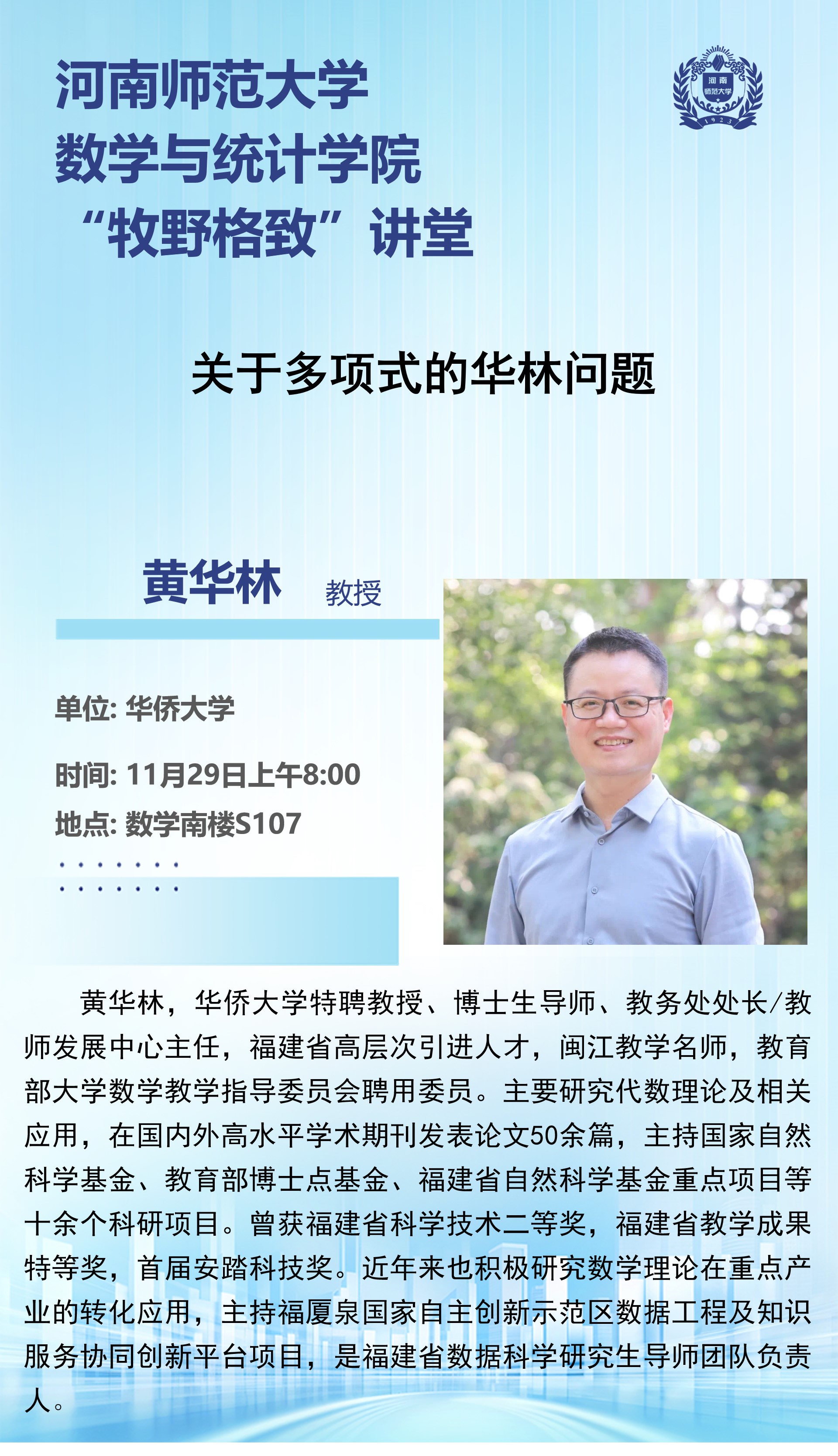 华侨大学黄华林教授将应邀做客“牧野格致”讲堂